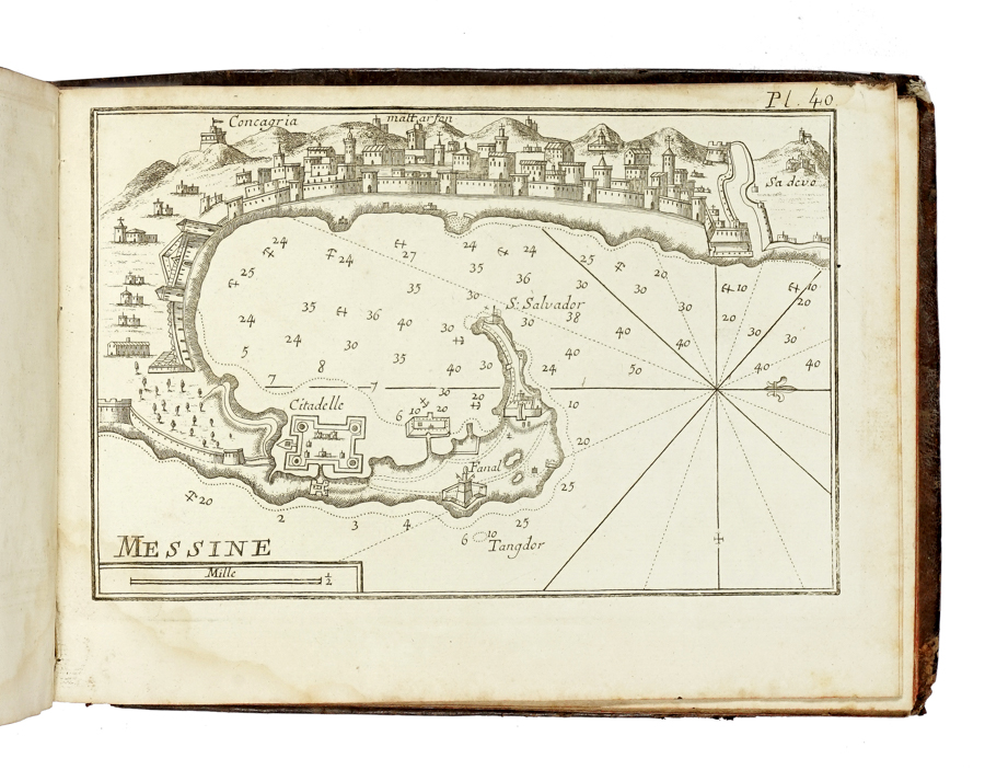 Roux Joseph, Receuil des principaux plans, des portes, et rades de la Mer Mediterranée, estraits de ma carte en douze feüilles... Marseille: s.e., 1764. In-8° oblungo (mm 160x215). Frontespizio calcografico firmato da Laurent, 170 carte geografiche in rame numerate, 1 carta d'indice. Esemplare macchiato e fiorito, con gora a gran parte del volume, accentuata alle tavole 90-108. Legatura in piena pelle muta, con tagli rossi. Abrasioni ai piatti e mancanze alle cuffie e alle punte. (1)Importante raccolta di piante dei porti europei che godette di ampia fortuna. Sono raffigurati, fra gli altri, i porti di: Ancona, Alessandria, Barcellona, Brindisi, Cadice, Civitavecchia, Cagliari, Corfù, Cefalonia, Dardanelli, Fiume, Gibilterra, Genova, Galipoli, Livorno, Malaga, Messina, Milazzo, Malta, Napoli, Spalato, Salonicco, Smirne, Trapani, Tangeri, Tunisi, Trieste, Venezia, etc. Importante raccolta di piante dei porti europei che godette di ampia fortuna. Phillips 1, 195.