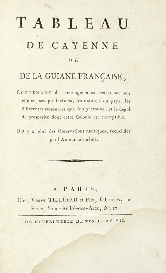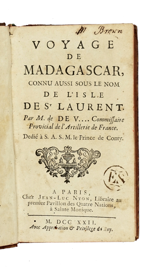 Smith William, Nouveau voyage de Guinée... Premiere (-seconde) partie. A Paris: chez Durand, Pissot, 1751. 2 volumi in-12° (mm 163x92). Con 5 tavole ripiegate legate in fine del secondo volume. Legatura coeva in piena pelle con titoli in oro su tassello al dorso. Tagli rossi, sguardie in carta marmorizzata. Mancanze a piatti e dorso. Ex-libris di precedente proprietario al contropiatto anteriore. SI AGGIUNGONO: Saussay Cajeau du, Voyage de Madagascar, connu aussi sous le nom de l'isle de St Laurent. Paris: Jean-Luc Nyon, 1722. 1 volume in-12° (mm 155x85). Le Mascrier Jean-Baptiste, Description de l'Égypte. Tome premiere (-second). The Hague: Isaac Beauregard, 1740. 2 volumi in-12° (mm 170x95). Terraube Gallard de, Tableau de Cayenne ou de la Guiane Française... Paris, Chez Veuve Tilliard et Fils, de l'Imprimerie de Testu, An VII. 1 volume in-8° (mm 195x120). (6)I OPERA: Prima edizione francese, realizzata a partire dalla prima inglese del 1744, del resoconto di viaggio sulle coste della Guinea intrapreso da William Smith per conto della Royal African Company. L'opera è arricchita da alcune tavole zoologiche incise. Sabin 84561.