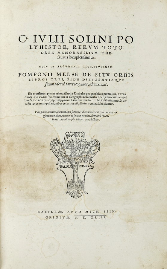 Solinus Caius Iulius, Polyhistor, rerum toto orbe memorabilium thesaurus locupletissimus [...] de situ orbis libros tres. Basileae: apud Mich. Isingrinum, 1543.