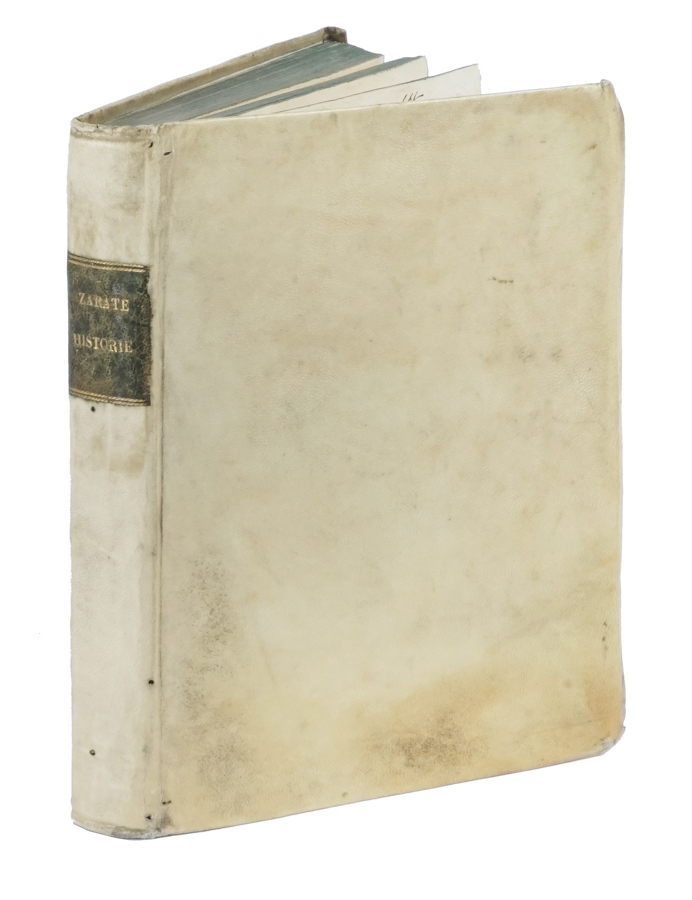 Zárate Agustin (de), Le historie [...] dello scoprimento et conquista del Perù [...] Nuovamente di lingua castigliana tradotte... In Vinegia: appresso Gabriel Giolito de' Ferrari, 1563. In-4° (mm 202x146). Pagine [16], 294, [2] bianca. Marca tipografica in legno al frontespizio e al verso dell'ultima carta; testatine, capilettera e finalini xilografici. Un forellino di tarlo restaurato al primo fascicolo e una gora marginale a quasi tutto il volume, molto accentuata ai fascicoli R⁸ e T⁸. Legatura seicentesca in piena pergamena, con titoli in oro su tassello al dorso e tagli blu. Ex-libris al contropiatto anteriore. (1)Prima traduzione italiana del racconto di Zárate sulla conquista del Perù, pubblicata per la prima volta in spagnolo nel 1555. Adam Z, 73; EDIT 16 26448; Sabin 106270-71; Palau 379633.