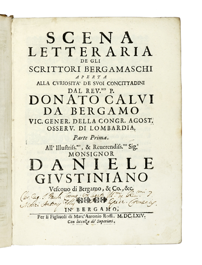 Calvi Donato, Scena letteraria degli scrittori bergamaschi aperta alla curiosità dei suoi concittadini... Parte prima (-seconda). In Bergamo: per li Figliuoli di Marc'Antonio Rossi, 1664.