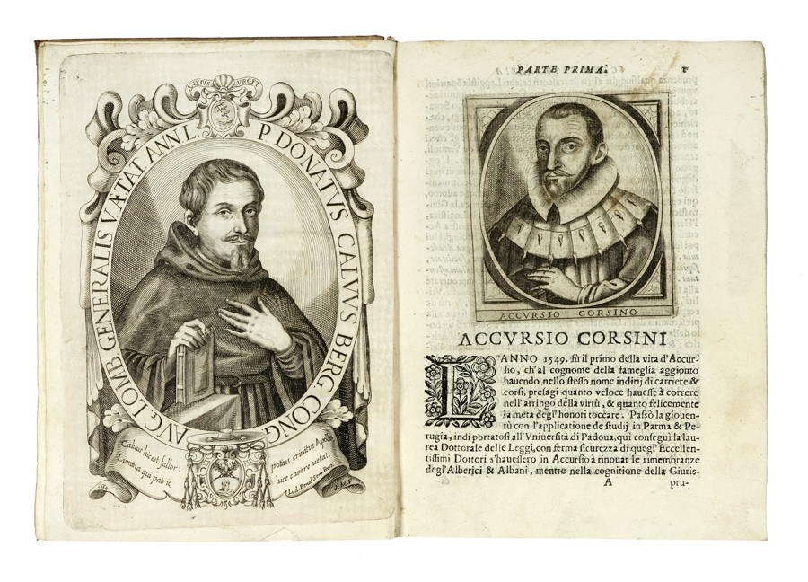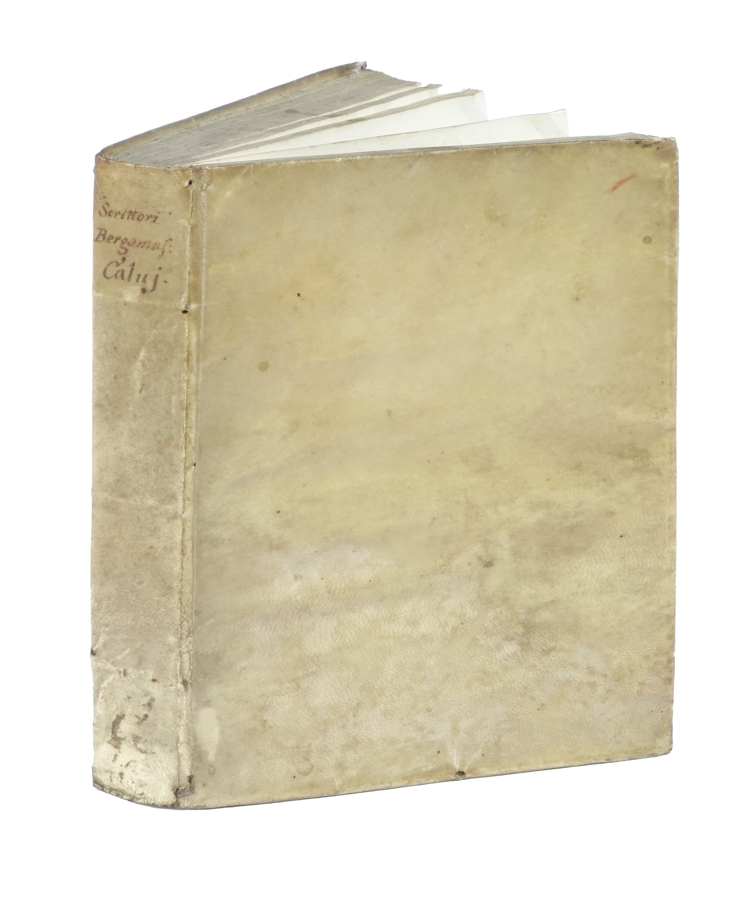 Calvi Donato, Scena letteraria degli scrittori bergamaschi aperta alla curiosità dei suoi concittadini... Parte prima (-seconda). In Bergamo: per li Figliuoli di Marc'Antonio Rossi, 1664. 2 parti in 1 volume in-3° (mm 212x160). Pagine [16], 519 [i.e. 523], 1 bianca con 1 antiporta figurata e 1 ritratto calcografico in principio; 58, [2], p. num. 59, 1 bianca. Numerosi ritratti calcografici nel testo, oltre a capilettera incisi in legno. Alcune fioriture marginali, rari strappetti, complessivamente ottima copia, fresca e ben impressa. Legatura in piena pergamena floscia con titoli manoscritti al dorso. Note di possesso manoscritte al frontespizio della prima parte e in principio di volume. (1)Prima edizione. Interessante trattato bio-bibliografico sugli scrittori bergamaschi. Lozzi 319; Choix, 15596; Coleti p. 17.