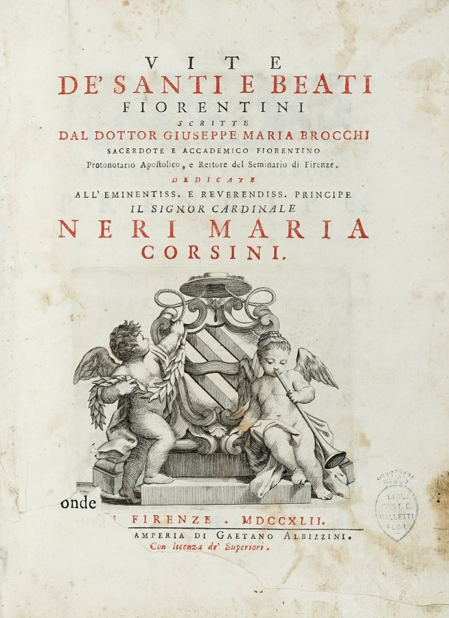 Brocchi Giuseppe Maria, Vite de' santi e beati fiorentini... In Firenze: nella stamperia di Gaetano Albizzini, 1742.