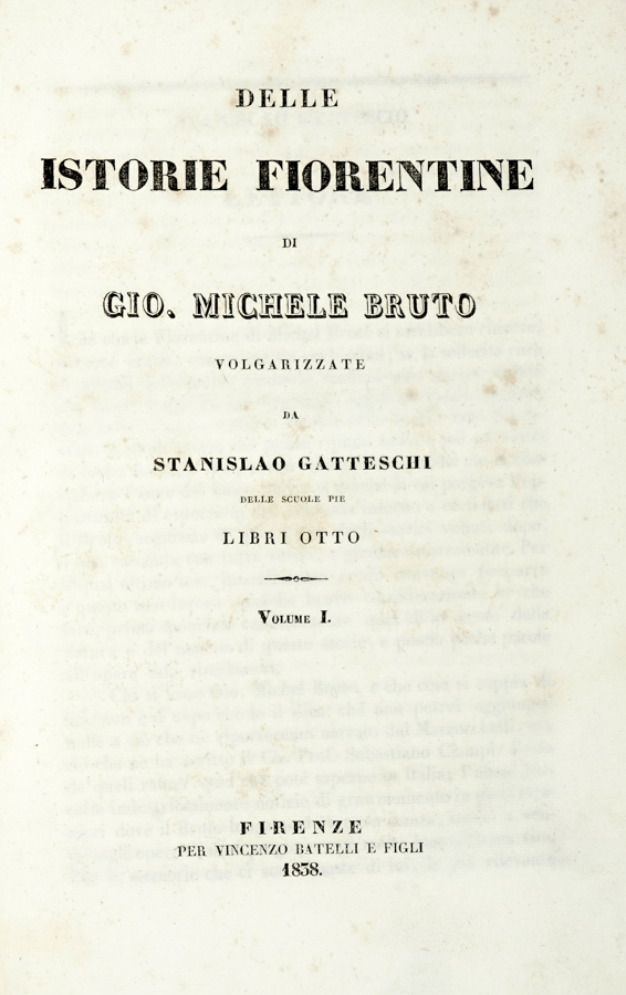 Bruto Gian Michele, Delle istorie fiorentine [...] volgarizzate da Stanislao Gatteschi. Volume I (-II). Firenze: Vincenzo Batelli e figli, 1838.