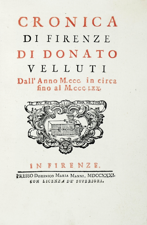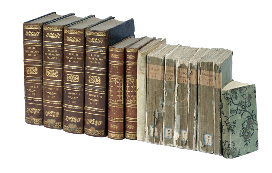 Del Bruno Raffaello, Ristretto delle cose più notabili della città di Firenze. In Firenze: Nella Stamperia di Gio. Batista Stecchi, e Anton-Giuseppe Pagani, 1767. In-12° (mm 150x83). Pagine XII, 216, con 1 graziosa pianta calcografica di Firenze ripiegata fuori testo. Testatine, capilettera e finalini in legno nel testo. Fioriture sparse, alcune carte lievemente brunite. Legatura in pieno cartonato decorato. Un'abrasione e una macchia al piatto posteriore. SI AGGIUNGE: Velluti Donato, Cronica... In Firenze. presso Domenico Maria Manni, 1731. In-4° (mm 218x150). Pagine [2], 35, [1], 158. Assente la carta V1. Frontespizio in rosso e nero con marca xilografica tipografica dell'Accademia della Crusca (con buratto e motto "il più bel fior ne coglie"). Testatine, capilettera e finalini in legno. Bruniture alle carte, concentrate in particolare ai fascicoli L-M. Esemplare postillato. Legatura in piena pergamena con titoli manoscritti al dorso, parzialmente staccata. Macchie ai piatti. Nota di possesso manoscritta al foglio di guardia anteriore. SI AGGIUNGE: Borghini Vincenzo, Discorsi... Milano: dalla Società tipografica de' Classici Italiani, 1808-1809. 4 volumi in-8° (mm 214x137). In brossura. Titoli su tasselli in carta al dorso. Vistose mancanze ai dorsi, alcuni fascicoli staccati. SI AGGIUNGE: Manuzzi Giuseppe, Vocabolario della lingua italiana già compilato dagli accademici della Crusca... In Firenze: appresso David Passigli e socj, 1833-40. 4 volumi in-8° (mm 268x176). Primo volume acefalo. Fioriture sparse alle carte. Legatura in mezza pelle con piatti in carta marmorizzata e titoli in oro al dorso. Abrasioni a piatti e unghiature. SI AGGIUNGE: Nardi Jacopo, Istorie della città di Firenze... Firenze: Soc. Ed. del Nardi e del Varchi, 1842. 2 volumi in-8° (mm 225x143). Gora d'acqua al margine superiore di entrambi i volumi, fioriture sparse. Legatura in mezza pelle con piatti in carta marmorizzata e titoli in oro al dorso. Ultime 4 opere non collazionate, lotto non passibile di restituzione. (12)I OPERA: Notizie sull'Autore in Melzi II, 487.
