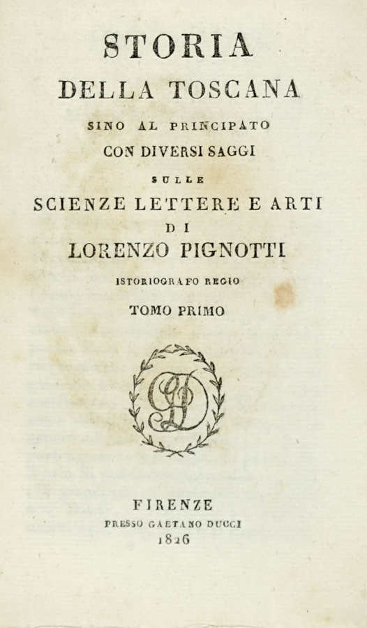 Pignotti Lorenzo, Storia della Toscana sino al Principato con diversi saggi sulle scienze lettere e arti [...] Tomo primo (-duodecimo). Firenze: presso Gaetano Ducci, 1826.