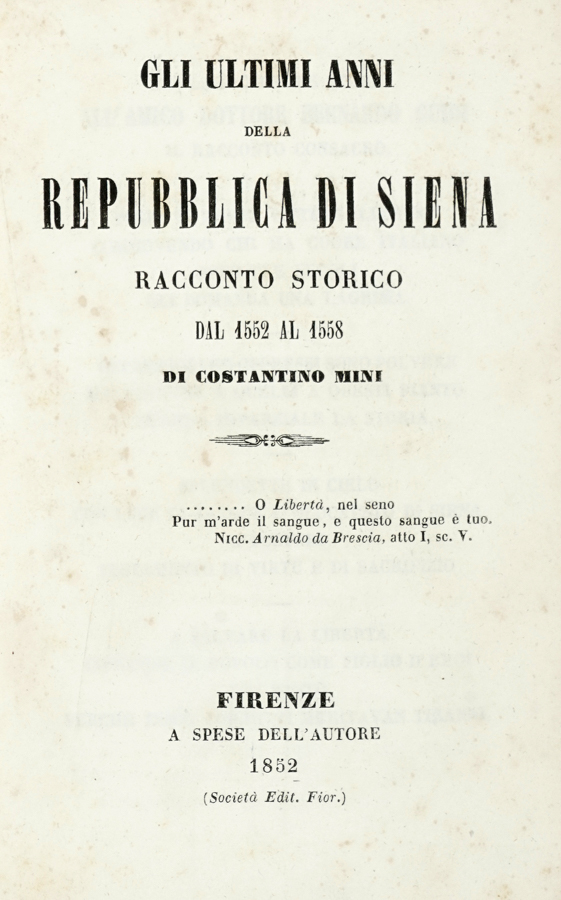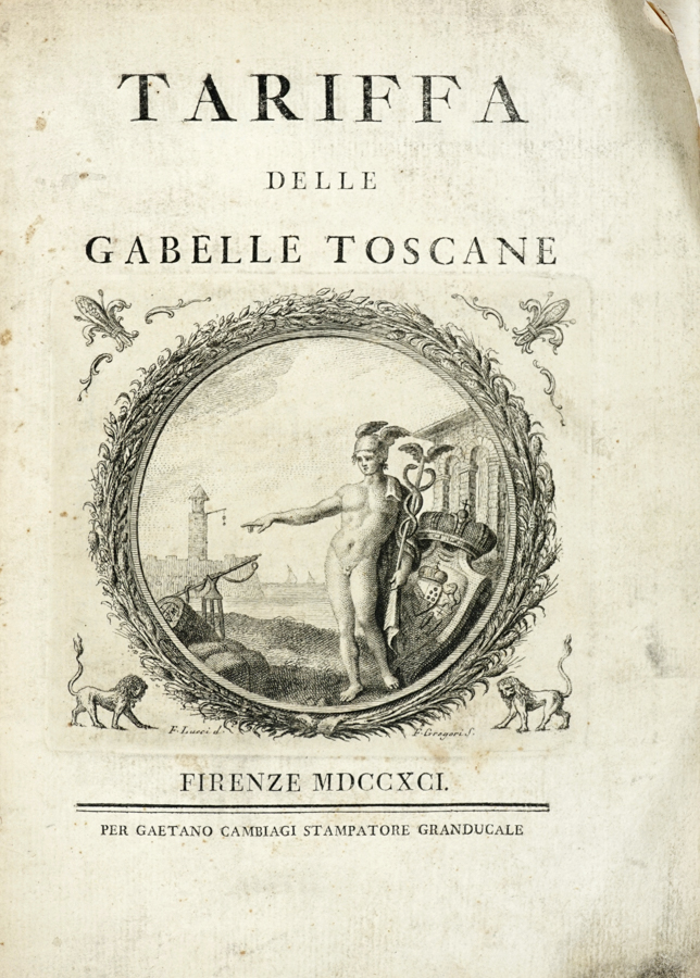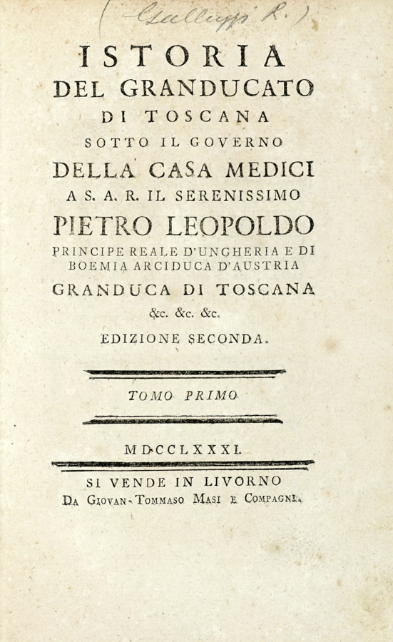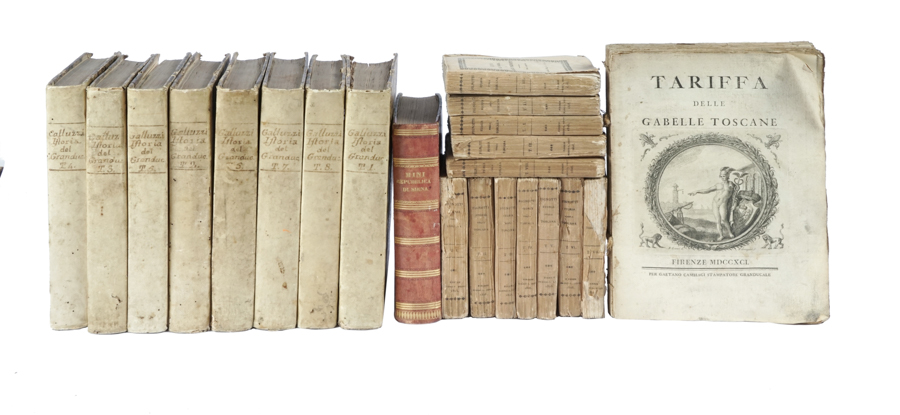 Pignotti Lorenzo, Storia della Toscana sino al Principato con diversi saggi sulle scienze lettere e arti [...] Tomo primo (-duodecimo). Firenze: presso Gaetano Ducci, 1826. 12 volumi in-12° (mm 133x90). Con 22 tavole calcografiche a piena pagina fuori testo, di cui 1 in antiporta con il ritratto dell'Autore. Bruniture concentrate ad alcune carte e fioriture sparse. Fascicoli allentati al volume VII. Brossura editoriale con titoli impressi in nero ai piatti e al dorso. Mancanze ai dorsi, in particolare ai volumi I e VII, e altri difetti a cuffie e cerniere. SI AGGIUNGE: Galluzzi Iacopo Riguccio, Istoria del granducato di Toscana sotto il governo della casa Medici [...] Tomo primo (-ottavo). Si vende in Livorno: da Giovan-Tommaso Masi e compagni, 1781. 8 volumi in-8° (mm 210x136). Con, complessivamente, 10 tavole calcografiche fuori testo di cui 2 più volte ripiegate con la genealogia della famiglia Medici. Carte uniformemente brunite con fioriture sparse e altri piccoli difetti. Annotazioni e sottolineature a matita nel testo. Legatura in mezza pergamena con punte e piatti in carta decorata. Titoli manoscritti ai dorsi e tagli spruzzati in rosso. Forellini di tarlo a dorsi e cerniere. Ex-libris di Lorenzo da Pitigliano Lanini al contropiatto anteriore di ciascun volume. SI AGGIUNGE: Tariffa delle gabelle toscane. Firenze: per Gaetano Cambiagi, 1791. In-4° (mm 247x180). Frontespizio calcografico con vignetta. Tracce d'uso al frontespizio e ad alcune carte, sporadiche fioriture e fascicoli lievemente allenati. Esemplare in barbe privo di legatura. SI AGGIUNGE: Mini Costantino, Gli ultimi anni della Repubblica di Siena... Firenze: a spese dell'autore, 1852. In-8° (mm 175x112). Con 2 tavole calcografiche fuori testo ripiegate. Foxing alle carte. Legatura in mezza pelle con piatti in carta marmorizzata. Titoli e decori in oro al dorso. (22)I OPERA: Ampia opera sulla Toscana sino al principato, scritta da Lorenzo Pignotti in qualità di storiografo di corte del Granduca Ferdinando III di Lorena e pubblicata postuma nel 1813, corredata da numerosi e curiosi aneddoti, documenti e appendici inseriti nel testo.