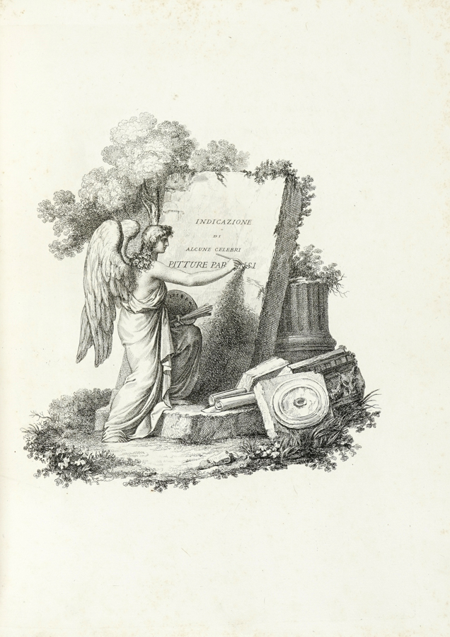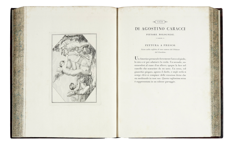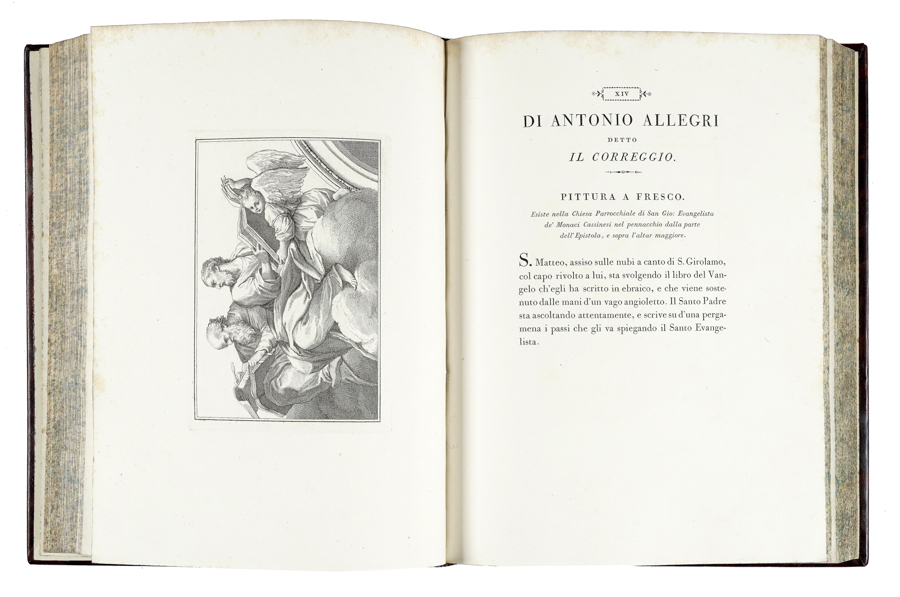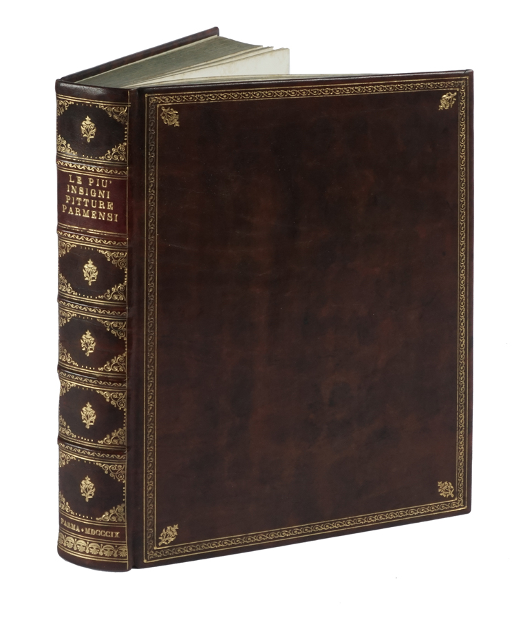 Rosaspina Francesco, Le più insigni pitture parmensi indicate agli amatori delle belle arti. Parma: dalla tipografia bodoniana, 1809 [i.e. 1816]. In-4° grande (mm 295x223). Pagine [10] di [12], XXII, XXXVIII, carte [118], pagine 7, 1 bianca, 7, 1 bianca con 1 frontespizio figurato (legato al termine della Préface) e 59 tavole calcografiche a piena pagina e fuori testo. Assente la prima carta bianca, rarissime fioriture, per il resto ottima copia, fresca e marginosa. Legatura moderna in piena pelle con cornici di filetti impresse ai piatti in oro e titolo in oro al dorso. Tagli spruzzati. (1)Pregevole opera del Bodoni sui più celebrati affreschi e dipinti di Parma. Cfr. Brooks 1060.