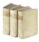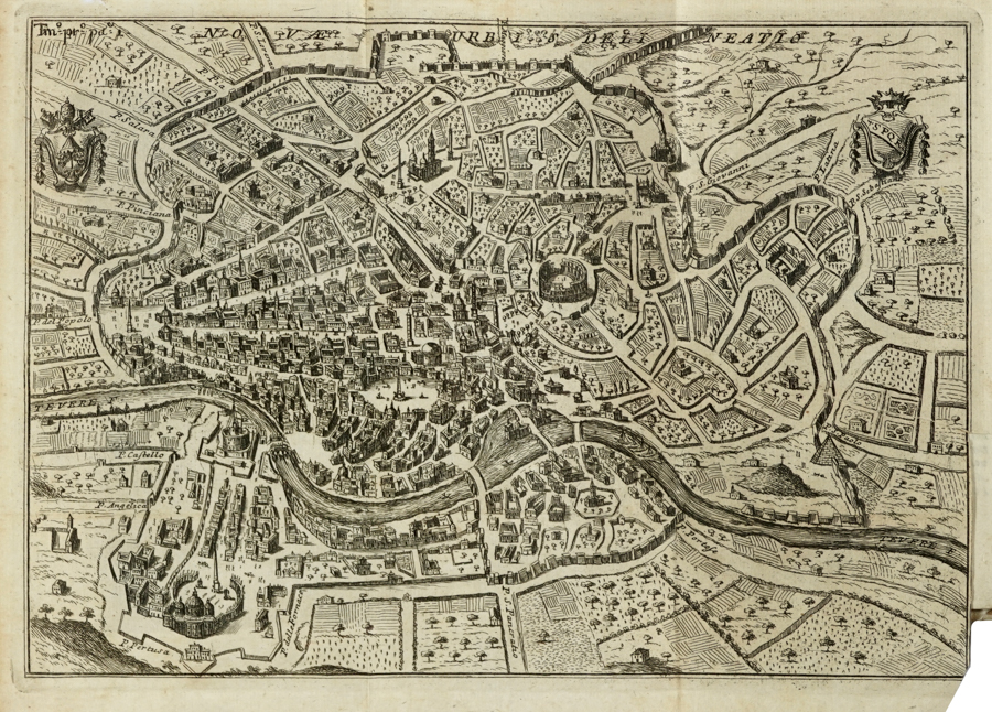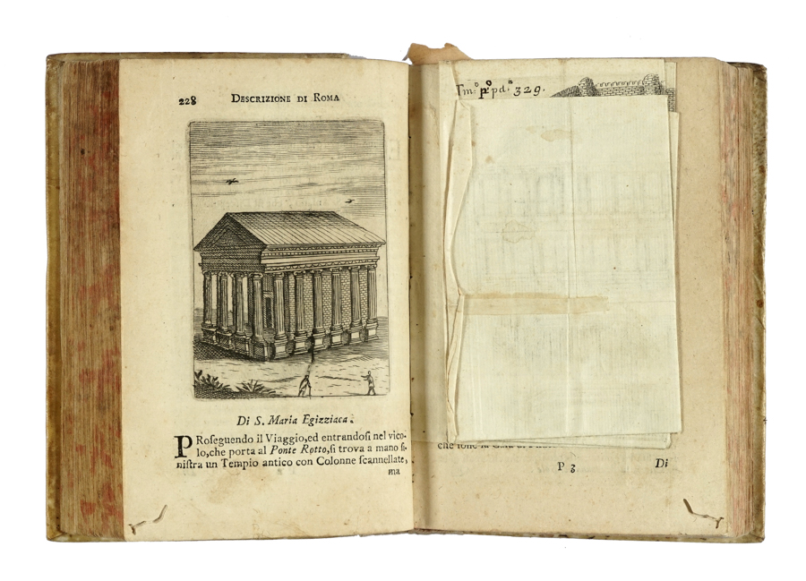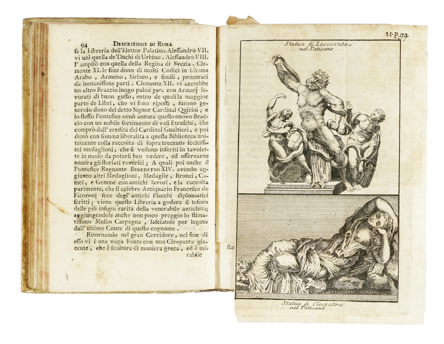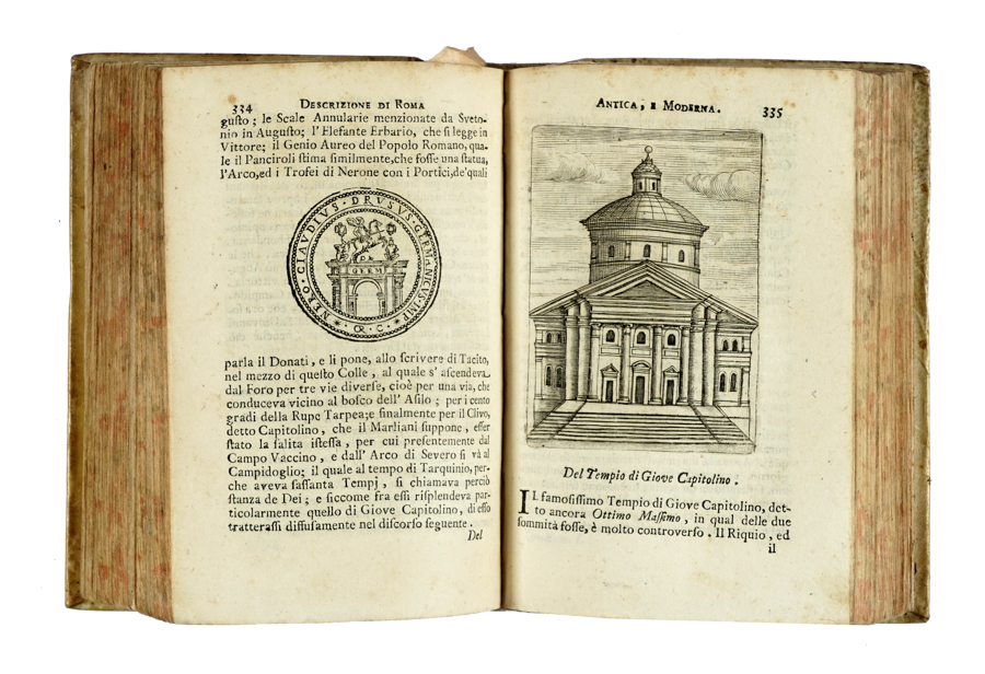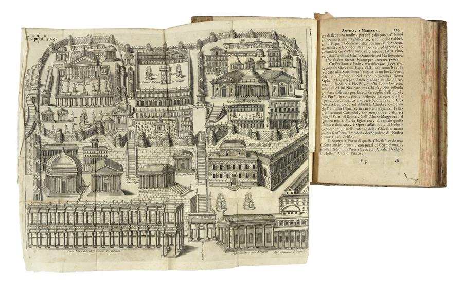 Roma antica, e moderna o sia Nuova descrizione di tutti gl'edificj antichi, e moderni, tanto sagri, quanto profani della città di Roma [...] Abbellita con duecento, e più figure di rame, e con curiose notizie istoriche [...] Tomo primo (-terzo). In Roma: appresso Gregorio Roisecco, mercante di libri in piazza Navona, nella stamperia Puccinelli, 1750. 3 volumi in-8° (mm 163x109). Pagine [4], XVI, 654 [i.e. 656] (le pagine 498-499 si ripetono) + 20 tavole in rame ripiegate; [4], 694, [2], con + 11 tavole in rame ripiegate; [8], 523, [5] + 1 tavola in rame e 1 tabella in legno ripiegata. In tutti e tre i volumi antiporta inciso, nel testo innumerevoli incisioni di medaglie e vedute di Roma. Bruniture alle carte, più intense ad alcuni fascicoli, tracce di umidità e fioriture sparse. Lavoro di tarlo al margine inferiore dei fascicoli O-Q e 2F-2I del volume I; dal fascicolo 2N fino alla fine, lavoro di tarlo nella parte centrale, con parziale perdita di testo. Piccoli restauri con pecette di rinforzo al verso della tavola legata a pagina 229 e all'angolo inferiore degli ultimi fascicoli. Al volume II restauro al margine inferiore di H2v, al volume III al margine superiore di 2K4. Legati in posizione errata i fascicoli Q e F del volume III. Altri piccoli marginali difetti. Legatura coeva in piena pergamena con titoli in oro su falso tassello al dorso. Tagli spruzzati. Una mancanza alla cuffia inferiore del volume I. Nota manoscritta a penna al piatto anteriore dello stesso. Timbro di precedente collezione al frontespizio del volume III. (3)Nel I volume due belle mappe ripiegate raffigurano rispettivamente Roma antica e Roma moderna. Il terzo volume ha un titolo proprio: Descrizione delli riti, guerre più celebri, e famiglie più illustri degl'antichi romani desunta da molti classici autori, ed abbellita di diverse figure in rame, con la cronologia in fine dei re, consoli, imperatori, e dei sommi pontefici romani...