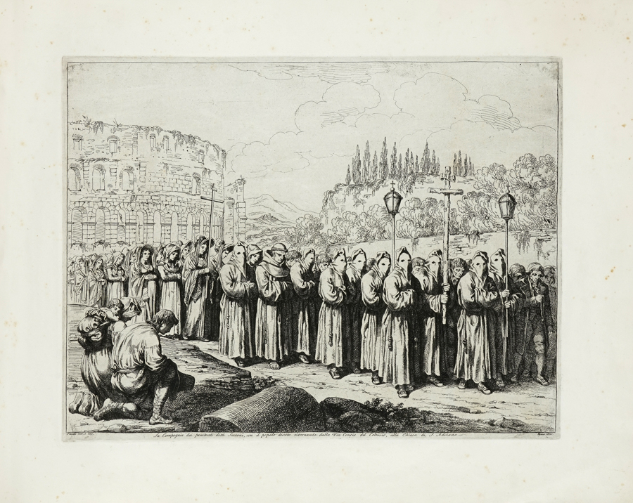Pinelli Bartolomeo, Costumi diversi inventati ed incisi da Bartolomeo Pinelli in n. 25 tavole. Roma: Luigi Fabri, 1822. In-folio oblungo (mm 445x56). 1 carta di frontespizio e 25 splendide tavole calcografiche disegnate e incise da Bartolomeo Pinelli, titolate e datate in lastra. Il tutto fuori testo. Diffuse fioriture, lieve gora al margine superiore e strappetti a quello inferiore delle tavole, altrimenti bella copia. Legatura in mezzo marocchino verde, con piatti marmorizzati. Forti abrasioni a piatti e dorso, mancanze alle cuffie e difetti alle cerniere. (1)Bella raccolta di tavole che raffigurano grandiose e animatissime scene folcloristiche e di vita popolare della Roma papalina; tra le migliori prodotte dall'Artista, rese ancora più suggestive dall'utilizzo della lastra di grande formato. Lipperheide 1267M; Colas 2383.