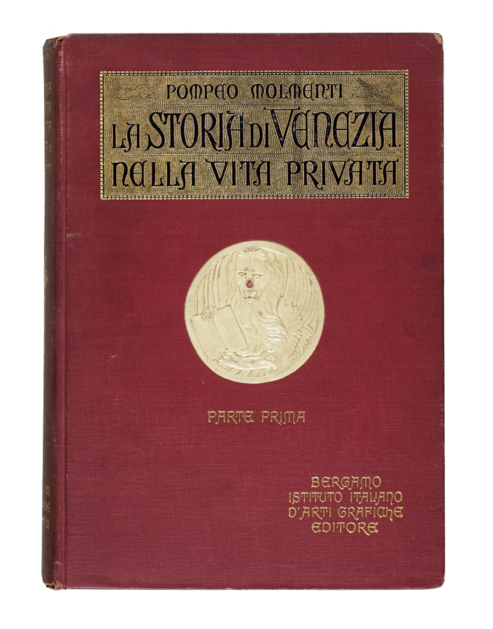 Molmenti Pompeo, La storia di Venezia nella vita privata dalle origini alla caduta della Repubblica... Parte prima (-terza). Bergamo: Istituto italiano d'arti grafiche, 1922-26. 3 volumi in-4° (mm 270x185). Numerose illustrazioni nel testo e fuori testo, in parte a colori. Legatura editoriale originale in tutta tela rossa con titolo impresso in oro e nero a piatti e dorso e medaglione con il leone marciano a sbalzo al centro del piatto anteriore di ciascun volume. (3)Splendida edizione, riccamente illustrata.