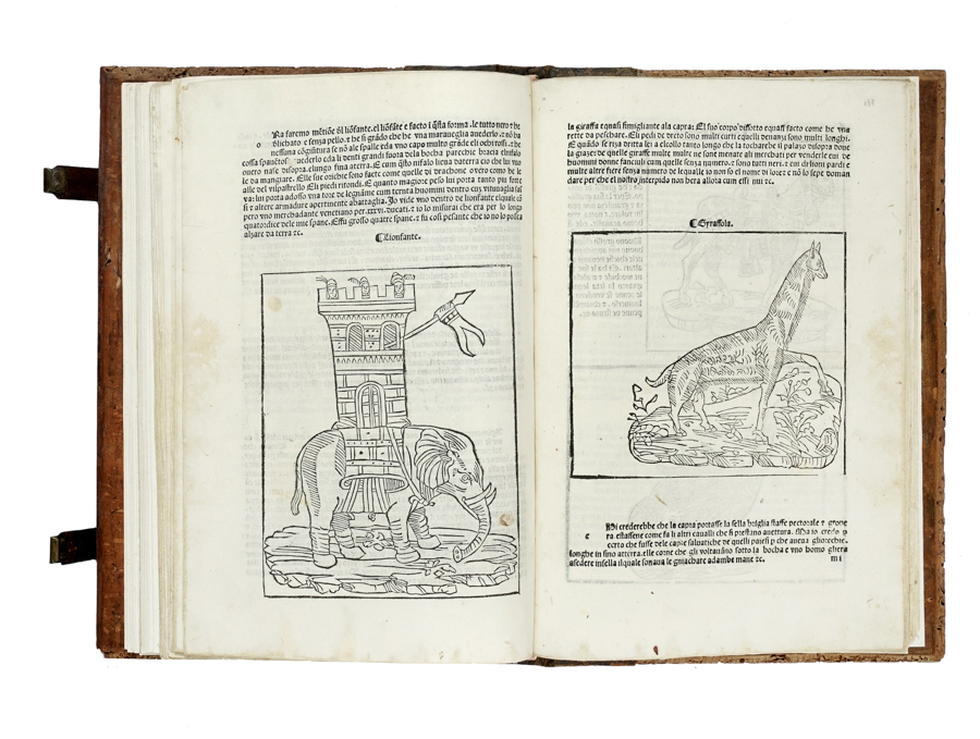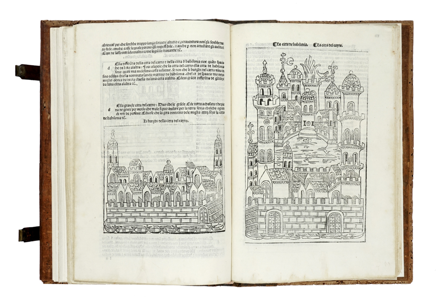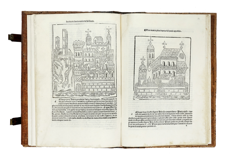 Poggibonsi Niccolò (da), Viaggio da Venezia alla santa Gerusalemme e al monte Sinai. (Al colophon:) Impresso ne lalma & inclita citta de Bologna: per mi Iustiniano da Rubiera, 1500. adi vj de Marzo. In-folio (mm 283x197). Carte [48] (di 68). Segnatura: a6 (-a6), b4 (-b4), c-d6 (-d6), e-h4 (-e4), i6, k-l4, m6, n4, o6. Testo in carattere gotico su 53 righe. Splendide illustrazioni xilografiche nel testo; marca xilografica al colophon. Spazi per iniziali con letterine guida. Mancanti i fascicoli a6 b4, d6 ed e4, tutti presenti in facsimile fotocopiato. Mancanze marginali reintegrate alla carta c1, c3, f4, k1, k2, l2, n3; con perdite alla carta o2-o5. Uno strappetto al margine inferiore della carta h1, qualche macchia, soprattutto all'ultima carta, e fioriture sparsa. Legatura in mezza pelle con piatti in legno coevo e dorso a 4 nervi e fermagli. Piatti fortemente tarlati e sguardie rinnovate. (1)Prima edizione di questo importante resoconto del pellegrinaggio in Terra Santa da Venezia, passando da Cipro, Damasco, Il Cairo e Alessandria, scritto dal francescano Niccolò da Poggibonsi in seguito al suo movimentato viaggio durato dal 1346 al 1350, durante il quale sopravvisse a naufragi e attacchi dai pirati. È considerata la prima guida di viaggio in lingua volgare, ma questa prima edizione a stampa non includeva il nome di Niccolò, così come nessuna delle edizioni successive. Le xilografie sono solitamente attribuite a Piero Ciza, in quanto il suo nome compare nella cornice del frontespizio, e sono tratte dai manoscritti illustrati rimasti, il più antico dei quali è plausibilmente proprio di Niccolò da Poggibonsi, con i disegni di ciò che vide. L'edizione successiva, stampata a Venezia nel 1518, conteneva ulteriori xilografie, alcune tratte dalla Peregrinatio in terram sanctam di Bernhard von Breydenbach che fu stampata per la prima volta nel 1486. Kathryn Blair Moore, The disappearance of an author and the emergence of a genre: Niccolò da Poggibonsi and pilgrimage guidebooks between manuscript and print, Renaissance Quarterly 66 (2013), 357-411; Sander 4998; BMC VI 850; Goff V267.