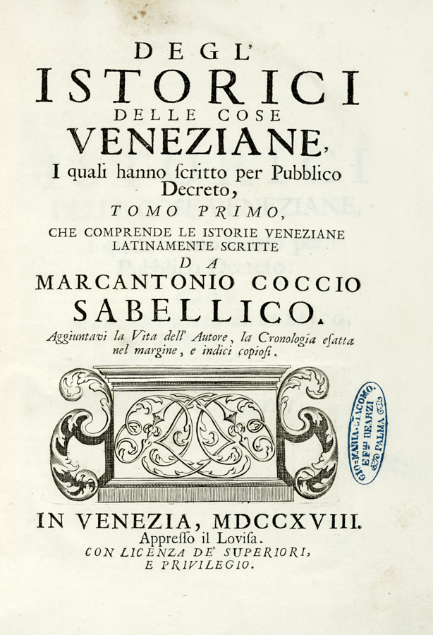 Sabellico Marco Antonio e altri, Degl'istorici delle cose veneziane, i quali hanno scritto per pubblico decreto, tomo primo [-decimo]. In Venezia: appresso il Lovisa, 1718-1722.