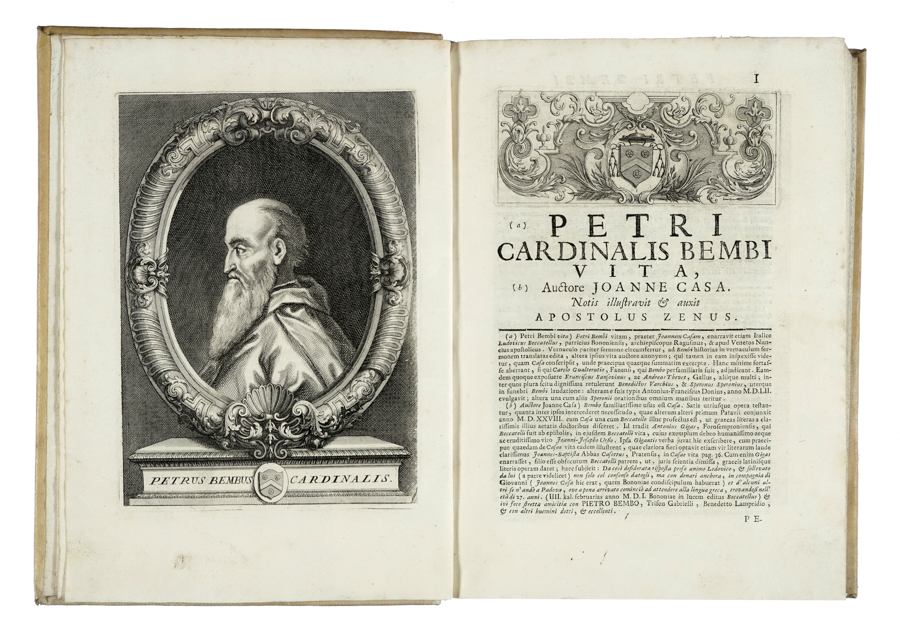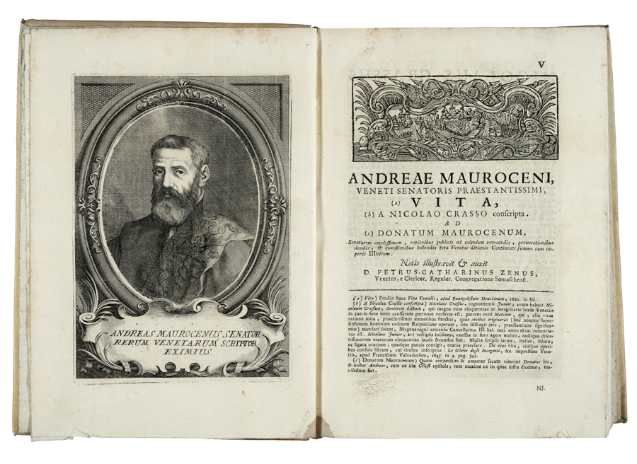 Sabellico Marco Antonio e altri, Degl'istorici delle cose veneziane, i quali hanno scritto per pubblico decreto, tomo primo [-decimo] che comprende le istorie veneziane latinamente scritte... In Venezia: appresso il Lovisa, 1718-1722. 10 volumi in-4° (mm 270x195). Marca calcografica al frontespizio, testatine e capilettera in legno e rame. Mancante l'antiporta al primo volume, disegnata da Giuseppe Camerata e incisa da Andrea Zucchi, rare fioriture e gore marginali, altrimenti ottima e fresca copia. Legatura coeva in piena pergamena, con titoli in oro su tassello al dorso; tagli spruzzati di verde. Collazione disponibile su richiesta. Timbro di possesso al frontespizio. (10)Cicogna 576: «Tutti poi i suddetti primi sei storici, cioè: Sabellico, Bembo, Paruta, Morosini, Nani, Foscarini, vennero ristampati per le cure principalmente di Apostolo Zeno, in Venezia, pel Lovisa, nel 1718-1722, in volumi dieci in quarto, dei quali esemplari trovansi impressi in carta grande, premessavi erudita prefazione intorno agli Storici Veneziani, le Vite di ciascun autore, ed altre cose che rendono pregevolissima tale collezione, in cui tennesi l'originaria lingua degli autori».