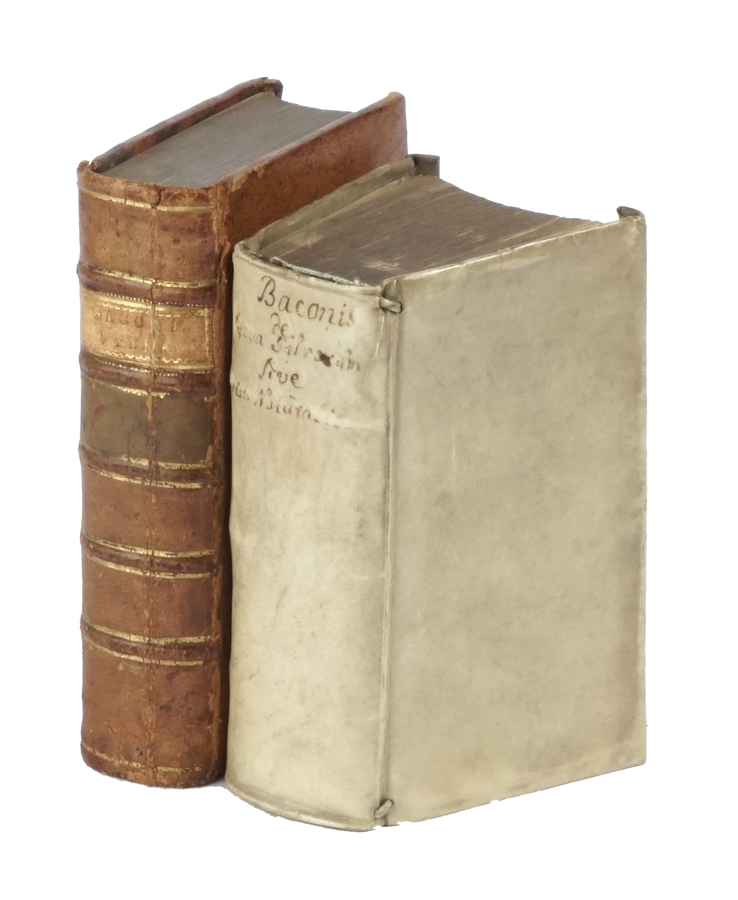 Bacon Francis, Sylva sylvarum sive Hist. Naturalis et Novus Atlas. Lug. Batavor: apud Franciscum Hackium, 1648. In-12° (mm 121x66). Pagine [36], 612, [48], 87, [1]. Con frontespizio inciso. Testatine, capilettera e finalini in legno nel testo. Carte lievemente brunite. Legatura in piena pergamena rigida con titoli manoscritti al dorso. SI AGGIUNGE: Id., Sylva sylvarum sive Hist. Naturalis et Nova Atlantis. Amstelodami: Ex Officina Elzeviriana, 1661 [i.e. Amstelaedami: apud R. & J. Wetstenios & G. Smith, 1730]. In-12° (mm 133x75). Pagine [32] di [34], 549, [39], 86. Assente la carta π1, contenente l'occhietto. Frontespizio inciso. Legatura in piena pelle con titoli in oro su tassello al dorso. Sguardie in carta decorata, tagli spruzzati.