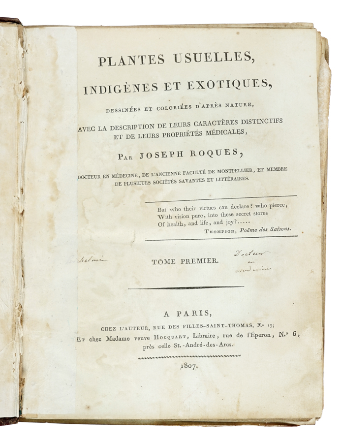 Roques Joseph, Plantes usuelles, indigènes et exotiques. Tome premier (-seconde). A Paris: chez l'Auteur [...] et chez Madame veuve Hocquart, 1807.