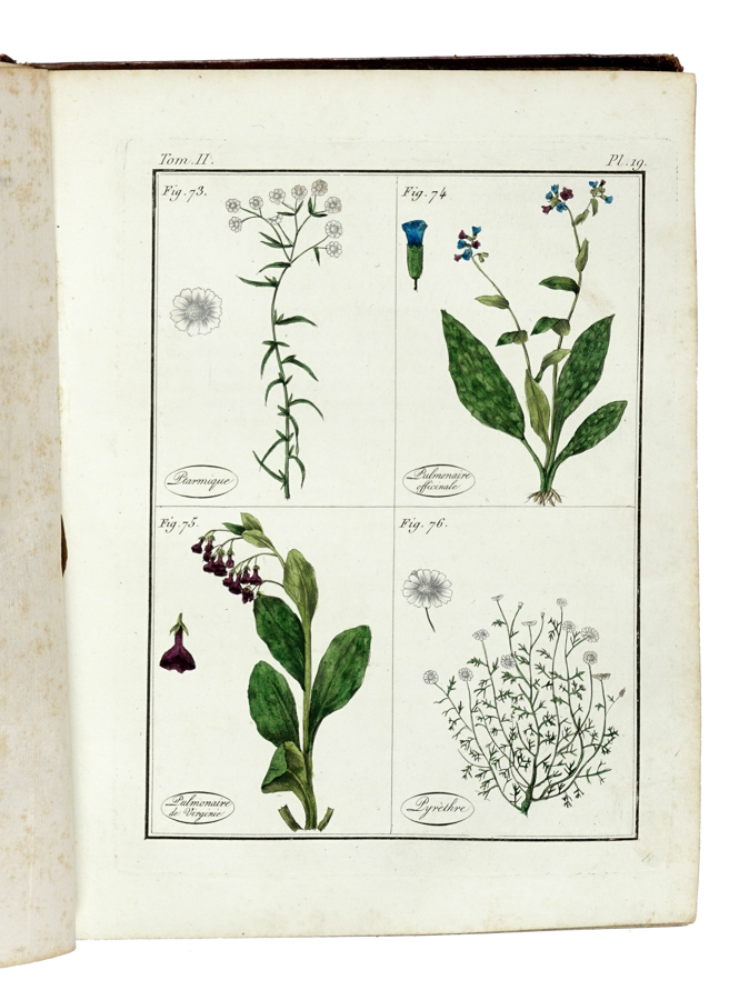 Roques Joseph, Plantes usuelles, indigènes et exotiques. Tome premier (-seconde). A Paris: chez l'Auteur [...] et chez Madame veuve Hocquart, 1807. 2 parti in 1 volume In-4° (mm 230x180). [6], VIII, 266 con 71 [di 72] tavole numerate 2-72; [4], 278, [2] con 61 tavole fuori testo numerate 1-61. Assente la prima tavola del primo volume, rinforzata la carta del frontespizio, parzialmente staccati i primi fascicoli del volume; nel secondo, frontespizio assente e supplito da una seconda copia del frontespizio della prima parte. Alcune delle tavole, in acquerellatura, presentano sbavature nel colore. Legatura coeva in piena pelle con impressioni a secco ai piatti e titolo in oro al dorso. Legatura parzialmente staccata. Copia fittamente postillata da mano antica. (1)Prima edizione. Interessante trattato botanico contenente le descrizioni, la storia e gli usi medicinali di numerose piante originarie della Francia e non, redatto dal medico e botanico francese Joseph Roques (1772-1850). Di ciascuna delle piante è fornita sia la tassonomia linneiana che la nomenclatura comune. Pritzel 8745.