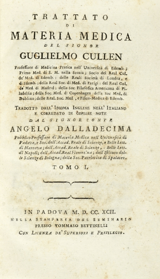 Cullen William, Trattato di materia medica… Tomo I (-VI). In Padova: Tommaso Bettinelli, 1792-94. In Padova: nella stamperia del Seminario presso Tommaso Bettinelli, 1792-1794.
