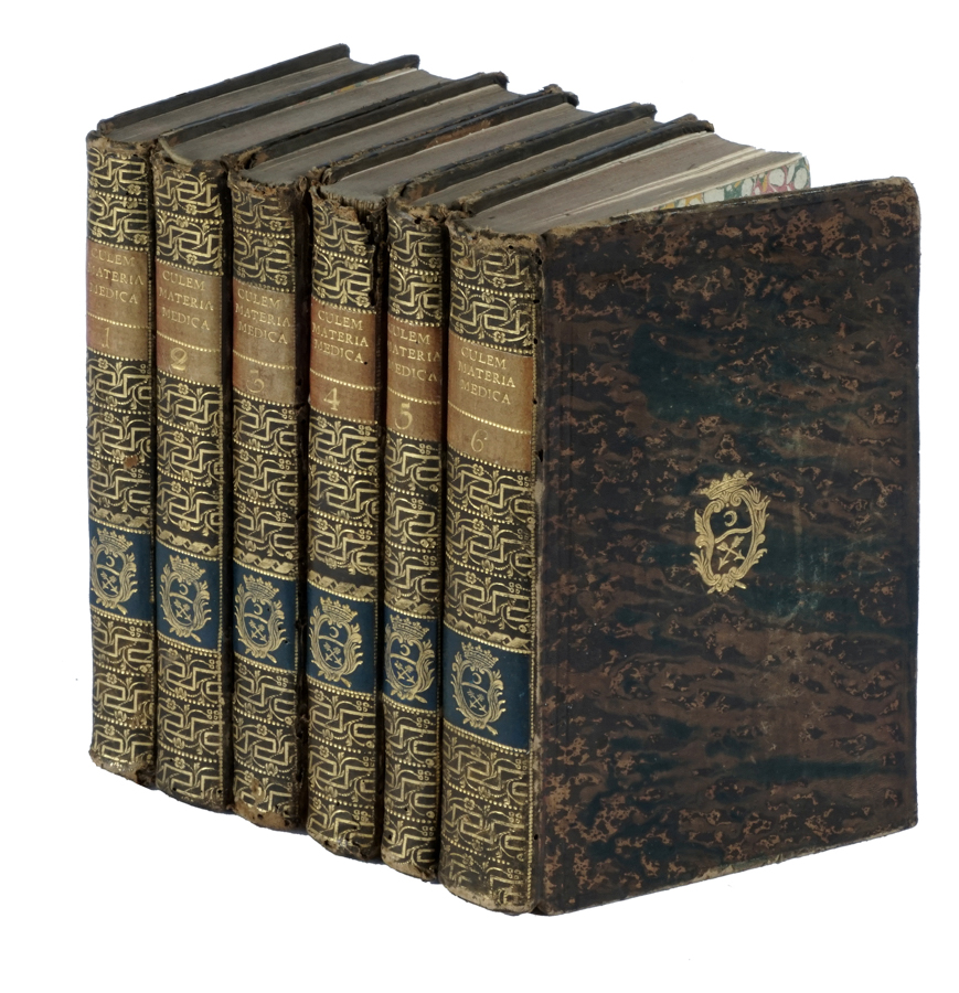 Cullen William, Trattato di materia medica… Tomo I (-VI). In Padova: Tommaso Bettinelli, 1792-94. In Padova: nella stamperia del Seminario presso Tommaso Bettinelli, 1792-1794. 6 volumi in-8° (mm 190x111). Alcune fioriture. Bella legatura coeva in piena pelle con titolo e decorazioni in oro al dorso e armi, anch'esse in oro, al centro di tutti i piatti anteriori. Tagli spruzzati, sguardie marmorizzate. (6)