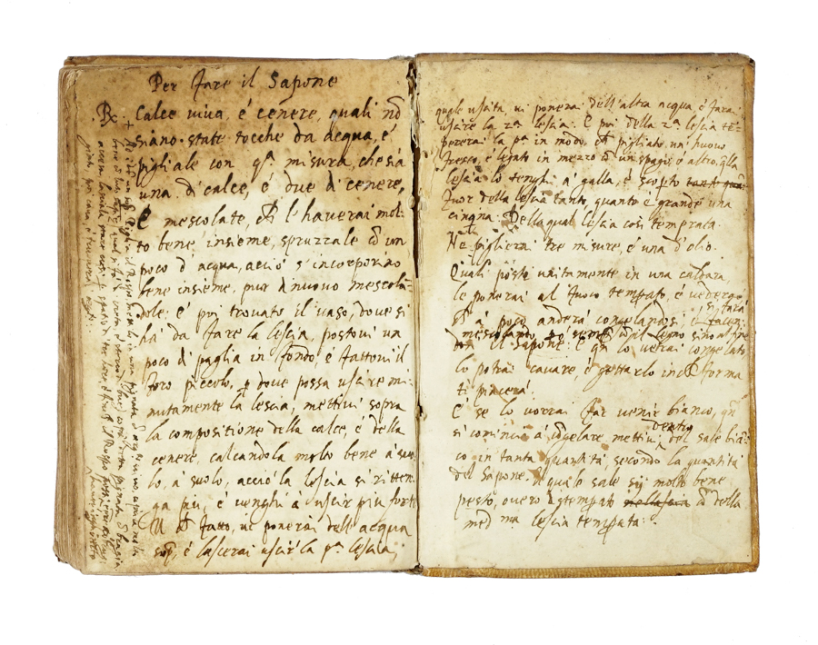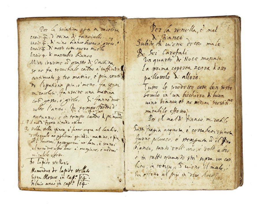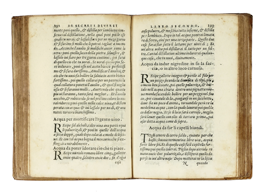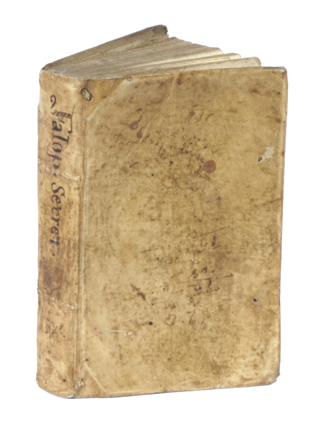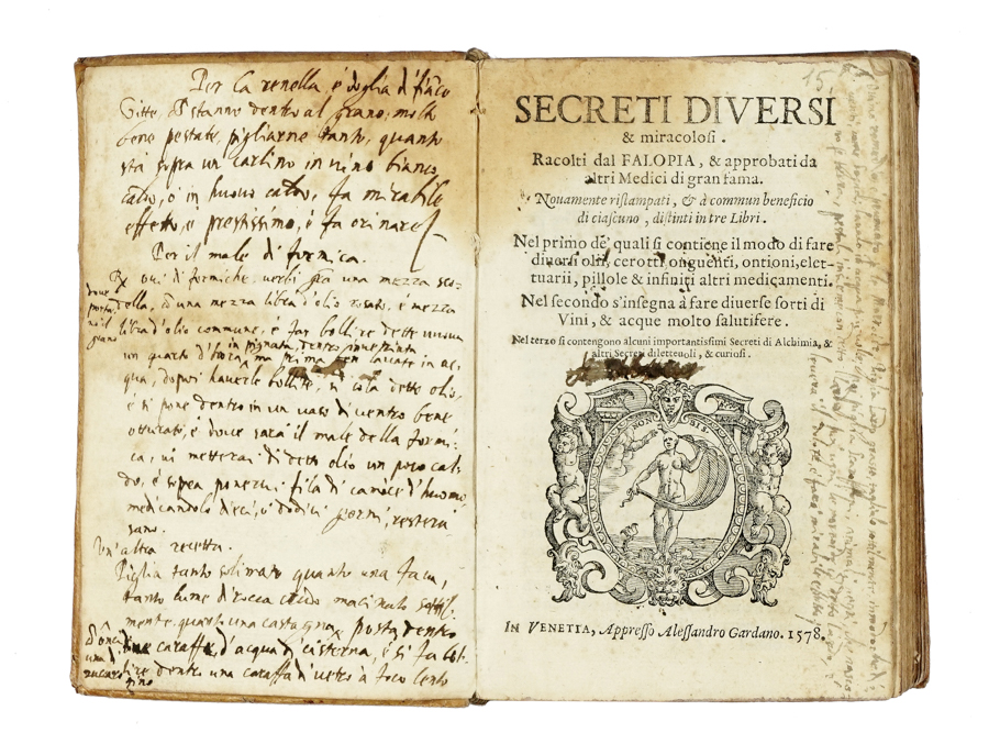 Falloppio Gabriele, Secreti diversi & miracolosi. Racolti dal Falopia, & approbati da altri medici di gran fama. Nuovamente ristampati, & a commun beneficio di ciascuno, distinti in tre libri... In Venetia: appresso Alessandro Gardano, 1578. (Al colophon:) Venezia: Giacomo Leoncini, s.d. In-8° (mm 150x97). Pagine [32], 366, [2]. Marca tipografica in legno al frontespizio e al verso dell'ultima carta; capilettera xilografici. Ampia gora al margine superiore di tutto il volume; più accentuata, e con bruniture, ai fascicoli Y8-Z8. Legatura coeva in piena pergamena, con titoli manoscritti al dorso. Macchie e legacci mancanti ai piatti. Annotazione manoscritta marginale al frontespizio e al verso dell'ultima carta. Ricette manoscritte per sciatica, renella e per fare il sapone alle sguardie. (1)Questo volume di ricette ed esperimenti in materia domestica, tecnica e medica è attribuito al Falloppio ma è più probabile che sia stato opera di Leonardo Fioravanti. Fu stampato per la prima volta nel 1563, l'anno dopo la morte di Falloppio. EDIT 16 18549.