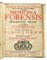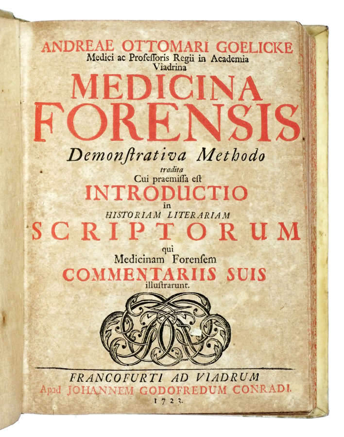 Fedele Fortunato, De relationibus medicorum libri quatuor. Panormi: apud Ioannem Antonium de Franciscis, 1602. In-4° (mm 195x145). Pagine [20], 352. PRECEDUTO DA: Goelicke Andreas Ottomar, Medicina forensis demosnstrativa methodo tradita cui praemissa est... Francofurti ad Viadrum: apud Johannem Godofredum Conradi, 1723. 2 parti in 1 volume. Pagine [24], 150 [i.e. 148]; [2], 69, 1 bianca, 53-112. Prima parte del volume fortemente brunita, leggere fioriture marginali nella seconda parte. Legatura successiva in piena pergamena rigida con titolo in oro su tassello al dorso, tagli spruzzati. (1)I OPERA: Prima edizione, assai rara, di questo interessante trattato del medico siciliano Fortunato Fedele, considerato il padre della medicina legale. Nel testo troviamo un compendio delle relazioni sui referti che i medici erano tenuti a produrre in caso di crimini e si propone come un manuale, analizzando numerose casistiche. Krivatsy 3966.