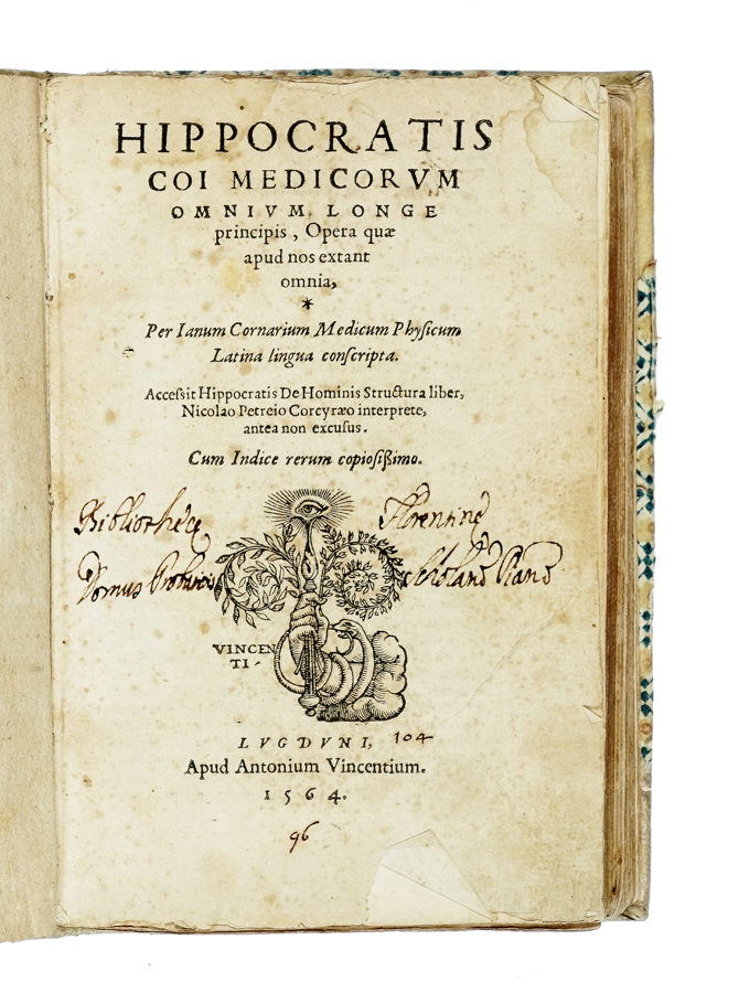 Hippocrates, Coi medicorum omnium longe principis, opera quae apud nos extant omnia... Lugduni: apud Antonium Vincentium, 1564.