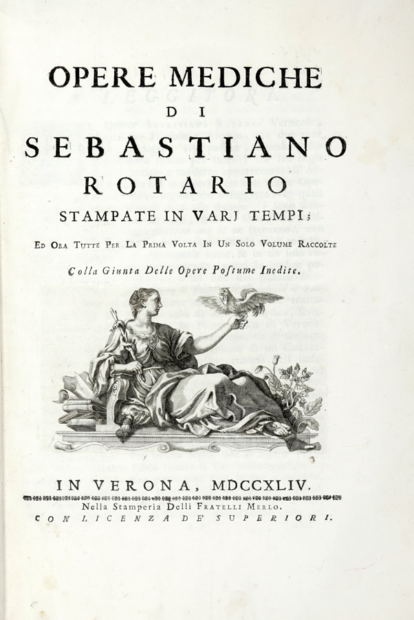 Hippocrates, Coi medicorum omnium longe principis, opera quae apud nos extant omnia... Lugduni: apud Antonium Vincentium, 1564. In-8° (mm 164x108). Carte [40], 298. Bruniture uniformi alle carte. Piccole gore e tracce di foxing sparse. Una bruciatura al margine interno superiore dei fascicoli centrali. Piccolo lavoro di tarlo che non lede il testo al margine superiore dei fascicoli B-D. Alcune annotazioni manoscritte lungo i margini delle carte. Legatura in mezza pergamena con punte e piatti in carta decorata con titoli manoscritti al dorso. Piatto anteriore parzialmente staccato. Note di possesso di antica mano al verso e al recto del frontespizio. SI AGGIUNGE: Rotari Sebastiano, Opere mediche... In Verona: nella stamperia delli fratelli Merlo, 1744. In-folio (mm 350x233). Pagine VIII, 527, [1]. Bella vignetta calcografica al frontespizio. Testatine, capilettera e finalini in legno nel testo. Lievi bruniture al frontespizio, altrimenti bell'esemplare, ad ampi margini. Legatura in piena pergamena muta. Tagli spruzzati in rosso. SI AGGIUNGE: Lemery Niccolò, Farmacopea universale che contiene tutte le composizioni di farmacia... In Venezia: Nella Stamperia dell'Hertz, 1735. Vignetta in rame al frontespizio. Strappi marginali ai primi e agli ultimi fascicoli. Strappo all'ultima carta. Privo di legatura.