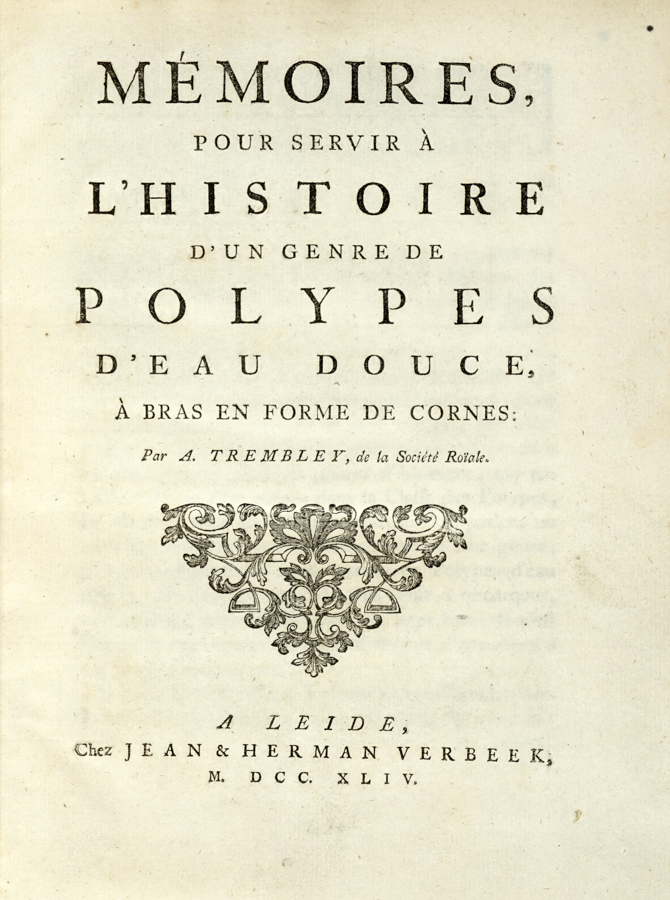 Trembley Abraham, Mémoires pour servir à l'histoire d'un genre de polypes d'eau douce, à bras en forme de cornes. A Leide: chez Jean & Herman Verbeek, 1744.
