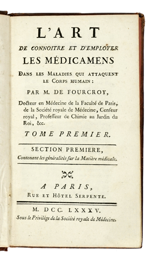 Vitet Louis, Traité de la sangsue médicinale. Paris: chez H. Nicolle, de l'imprimerie de Mame frères, 1809. In-8° (mm 195x120). Pagine [4], VI, 585, 1 bianca con 1 tavola ripiegata fuori testo. Alcuni errori di rilegatura nell'ultimo fascicolo di testo, senza perdite, occasionali fioriture e macchioline. Legatura coeva in mezza pelle con piatti in carta marmorizzata e titolo in oro al dorso. SI AGGIUNGE: M. de Fourcroy, L'art de connoitre et d'employer les médicamens [...] Tome premier (-second). A Paris: Hotel Serpente, 1785. 2 volumi in-12° (mm 165x95). Legatura coeva in piena pelle con titoli in oro su tassello al dorso. Tagli rossi, sguardie in carta marmorizzata. (3)I OPERA: Prima edizione postuma di questo trattato sugli usi medicinali delle sanguisughe compilata dal medico lionese Louis Vitet (1736-1809). Agassiz, Biliographia zoologica, p. 499.