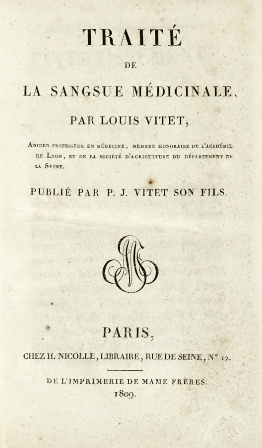 Vitet Louis, Traité de la sangsue médicinale. Paris: chez H. Nicolle, de l'imprimerie de Mame frères, 1809.