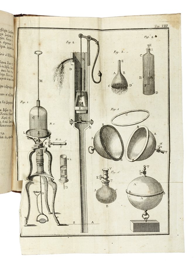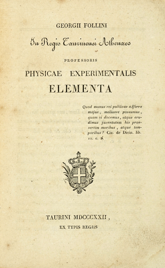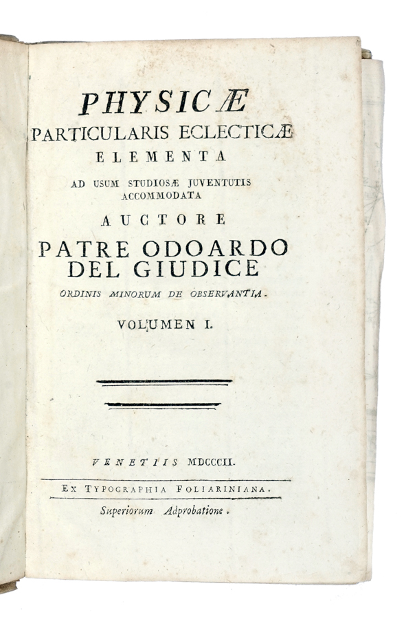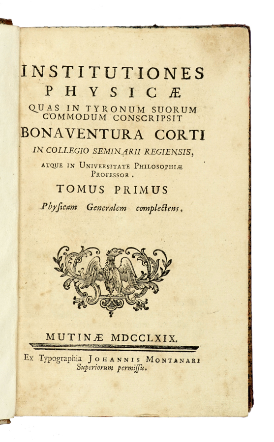Lotto composto di 9 opere di fisica. XVIII-XIX secolo. Compongono il lotto: 1) Doveri Leonardo, Elementi di fisica e sue principali applicazioni [...] Vol I (-II). Firenze: Tipografia galileiana, 1854-55. 2 tomi in 1 volume in-8° (mm 207x135). 2) Corti Bonaventura, Institutiones physicae quas in tyronum suorum [...] Tomus Primus (-secundus). Mutinae: Johannis Montanari, 1769-70. 2 volumi in-8° (mm 186x115). 3) Physicae experimentalis lineamenta ad subalpinos. Pars prima (-altera). Taurini: ex typographia Regia, 1793-94. 2 volumi in-8° (mm 191x124). 4) Georgii Follini, Physicae experimentalis elementa... Taurini: ex typis regiis, 1822. In-8° (mm 200x127). 5) Id., Physicae experimentalis elementa. Editio altera notationibus aucta. Taurini: ex typis regiis, 1823. In-8° (mm 181x117). Elenco completo disponibile su richiesta. (13)