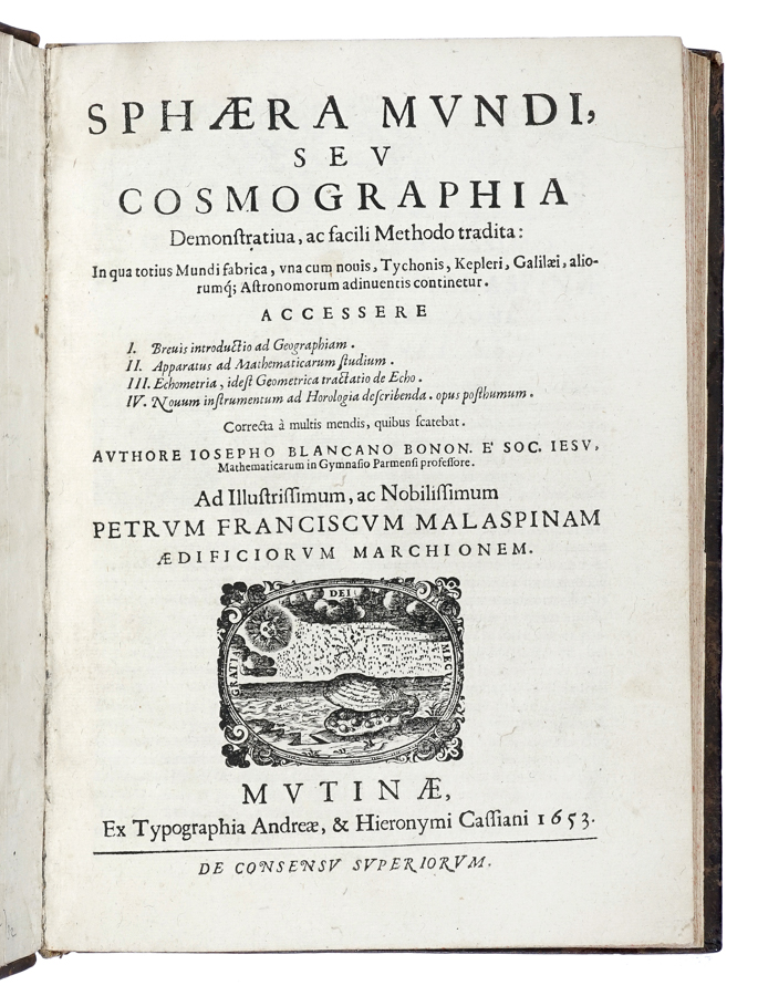 Biancani Giuseppe, Sphaera mundi, seu Cosmographia, demonstrativa, ac facili methodo tradita... Mutinae: ex typographia Andreae, & Hieronymi Cassiani, 1653.