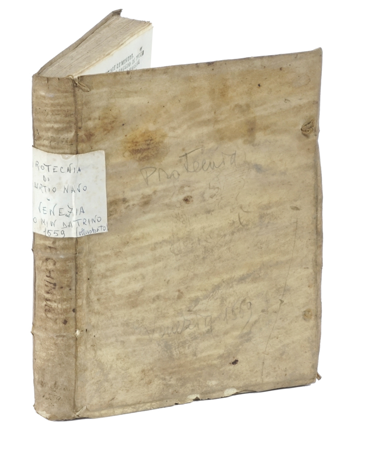 Biringuccio Vannoccio, Pirotechnia. [Venezia: Curzio Troiano Navò], 1558. (Al colophon:) In Vinegia: per Comin da Trino di Monteferrato, 1559. In-4° (mm 210x152). Carte [8], 168. Rilegate in fine 10 carte bianche. Frontespizio entro ampia cornice xilografica, marca dello stampatore al recto dell'ultima carta e molte vignette xilografiche nel testo. Copia marginalmente fiorita, con uno strappo che non tocca il testo a carta Q8. Legatura coeva in piena pergamena floscia. Titolo manoscritto su pecetta cartacea applicato successivamente al dorso. Lacerti di legacci. Alcune macchie ai piatti. Alcune note manoscritte e sottolineature di mano antica nel testo. (1)Terza edizione (la prima del 1540) della più importante opera sulla metallurgia e sulla mineralogia dell'età pre-moderna, con importanti capitoli anche di alchimia. Adams, 2083. Cfr. Duveen, 79-80; Cfr. Stillwell, 827.