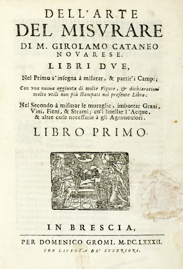 Cattaneo Girolamo, Dell'arte del misurare [...]. Libri due. Nel primo s'insegna a misurar, & partir'i. Libro primo (-secondo). In Brescia: per Domenico Gromi, 1682.