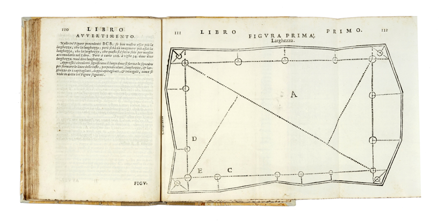 Cattaneo Girolamo, Dell'arte del misurare [...]. Libri due. Nel primo s'insegna a misurar, & partir'i [...] Nel secondo a misurar le muraglie, imbottar grani, vini, fieni, & strami; co'l liuellar l'acque, & altre cose necessarie a gli agrimensori. Libro primo (-secondo). In Brescia: per Domenico Gromi, 1682. 2 parti in 2 volumi in-4° (mm 195x135). Pagine 141; 117, [3]. Marca xilografica a entrambi i frontespizi; testatine e capilettera in legno. Ampie annotazioni manoscritte al verso della carta G12, bianca. Abrasione al primo frontespizio del primo libro e foro di tardo restaurato; macchie concentrate principalmente nell'ultima parte del secondo volume, altrimenti copia ben conservata. Legatura moderna in mezza pergamena con piatti marmorizzati e titoli in oro al dorso. (2)Edizione secentesca notevolmente accresciuta di questo noto manuale di geometria pratica e agrimensura redatto dal novarese Girolamo Cattaneo. La prima edizione apparve nel 1572 a Brescia, città in cui Cattaneo fu attivo come architetto e ingegnere militare tra il 1540 e il 1584. Il trattato è diviso in due libri: il primo espone i principî fondamentali della geometria pratica; il secondo ne illustra l'applicazione nella costruzione degli edifici e in agricoltura, in particolare nella misurazione di vino, acqua e grani. Riccardi I, 316-317.