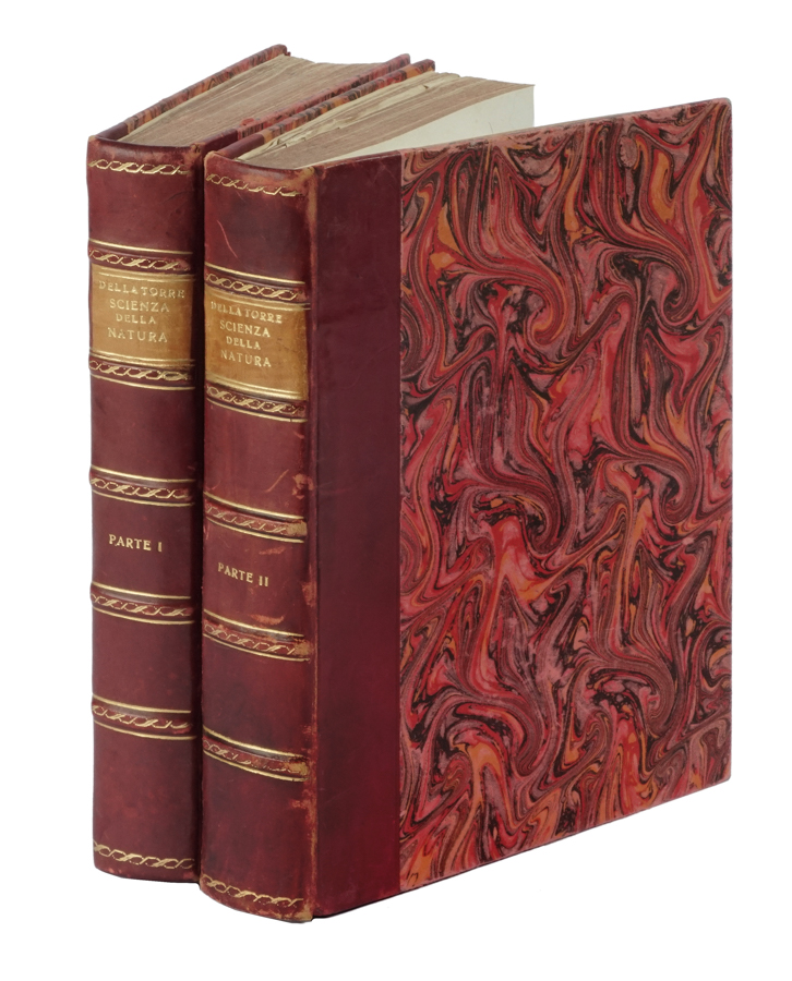 Della Torre Giovanni Maria, Scienza della natura generale [...] Parte prima (-seconda). In Venezia: presso Gio. Battista Recurti, 1750. 2 volumi in-4° (mm 236x172). Pagine xxiv, 436 + XXXI tavole in rame ripiegate fuori testo, di cui 2 tabelle xilografiche; [4], 600 + [31] tavole in rame ripiegate fuori testo, di cui 1 tabella xilografica, ordinate in varie sequenze con numeri romani. Vignetta xilografica ad entrambi i frontespizi, testatine e capilettera in legno nel testo. Lievi bruniture concentrate ad alcuni fascicoli. Legatura successiva in mezza pelle con piatti in carta marmorizzata e titoli in oro su tassello al dorso. Tagli spruzzati. (2)L'opera più importante del Della Torre, nella quale l'Autore presenta un quadro completo e ordinato dello stato delle conoscenze scientifiche del suo tempo, che ebbe notevole influenza nell'Italia del Settecento.