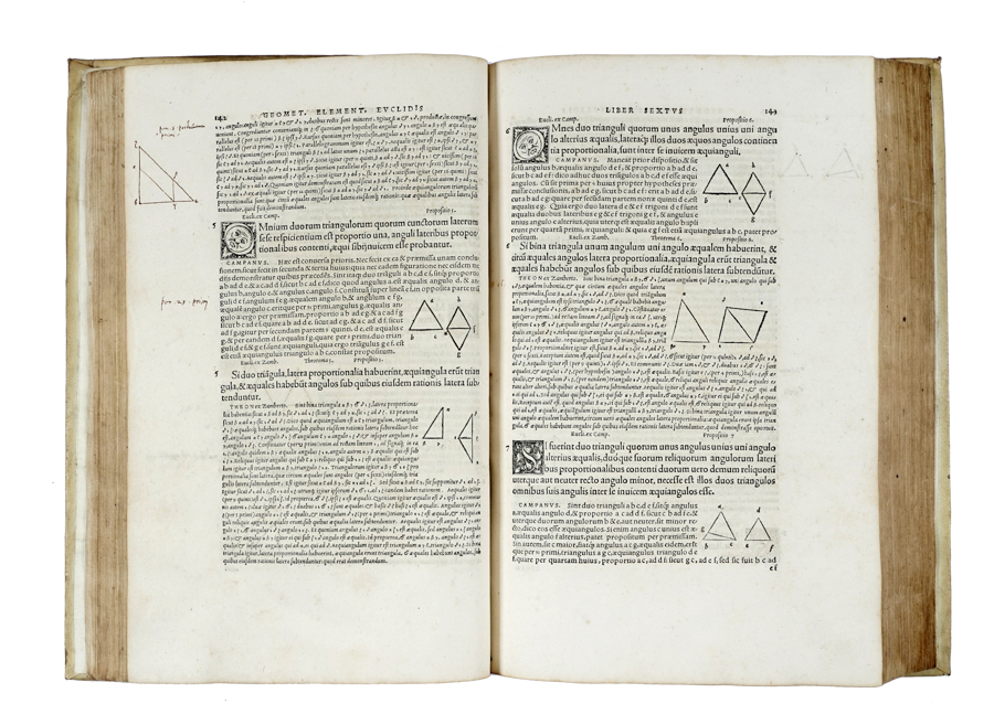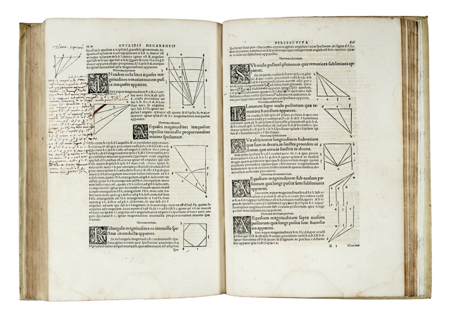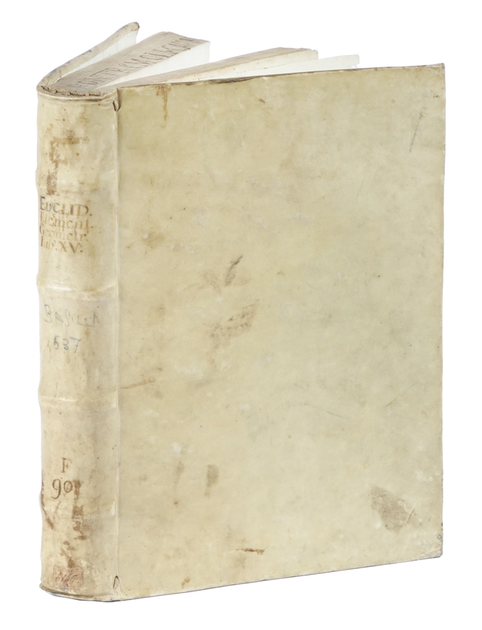 Euclides, Elementorum geometricorum. lib. XV. Basileae: apud Iohannem Hervagium, mense Augusto 1537. In folio (mm 313x200). Pagine [2] [di 8], 587, [1]. Numerosi legni nel testo. Copia scompleta delle 3 carte iniziali di Prefazione, con sporadiche e lievi bruniture e gore, ma complessivamente ottima copia, marginosa e ben impressa. Legatura successiva in piena pergamena rigida con titolo manoscritto al dorso. Nota di possesso manoscritta di antica mano al frontespizio. Numerose postille di mano antica nel testo. (1)Prima edizione latina per le stampe di Johann Herwagen. Il testo raccoglie l'opera omnia di Euclide. Al suo interno trovano posto anche trattati minori dell'autore, principalmente su geometria e ottica, e i commenti di Giovanni Campano e Bartolomeo Zamberti. La nostra copia, come molte in commercio, è priva della prefazione di Filippo Melantone, spesso censurata. Adams E 974.
