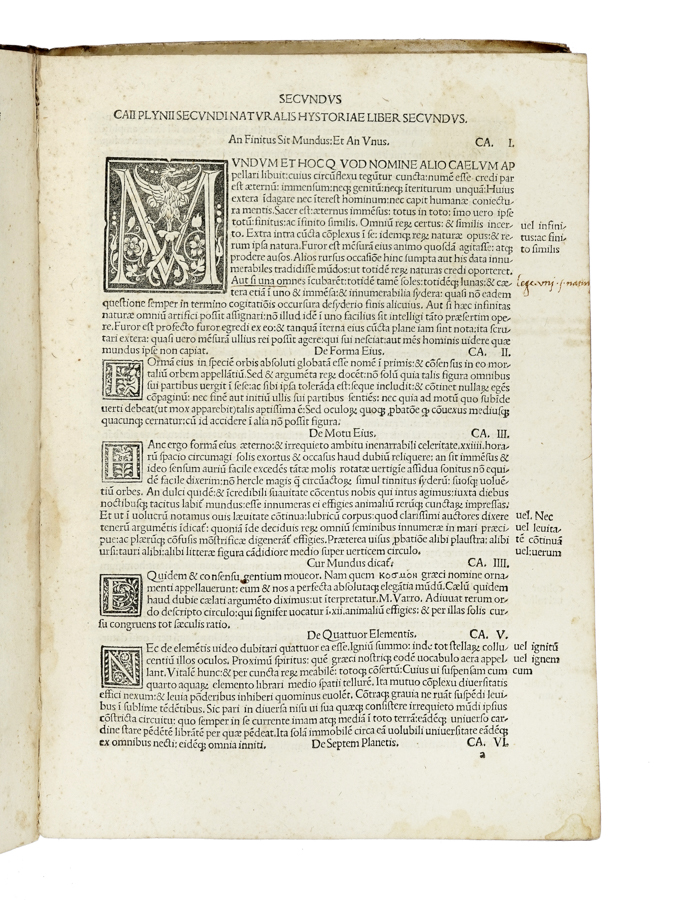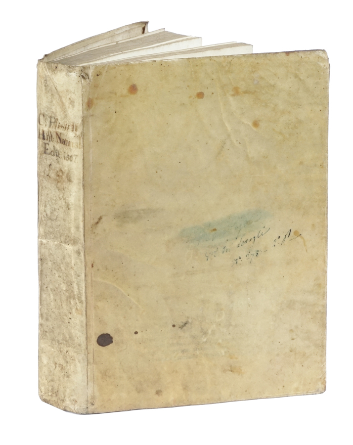 Plinius Secundus Gaius, [Historiae naturalis libri XXXVII]. (Al colophon:) [Venezia]: per Ioannem rubeum & Bernardinum fratresque Vercellenses, 1507. die. xvi. Ianuarii. In folio (mm 280x195). Carte [14] di [16], 280 [i.e. 279], [10]. Privo delle carte 2a1 (frontespizio), 2a2 e dell'ultima carta bianca. Saltata nella numerazione la carta 209. Occasionali fioriture marginali, ultima carta con macchie e difetti, ma buona copia. Legatura coeva in piena pergamena con titolo manoscritto al dorso. Alcune macchioline ai piatti, legatura parzialmente staccata. Postille di mano antica nel testo, alcune parzialmente lavate. (1)Interessante edizione nell'adattamento del filologo e umanista Alessandro Benedetti (1450-1512) che revisionò e curò il testo consultando nuovi reperti manoscritti. Schweiger II, p. 784; Graesse VI, 338.
