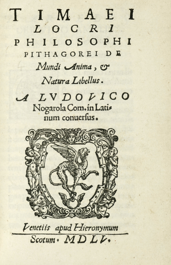 Timaeus Locrus, De Mundi Anima, et Natura Libellus. Venetiis: Apud Hieronymum Scotum, 1555.