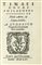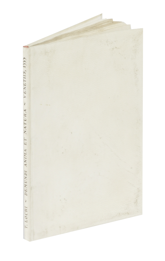 Timaeus Locrus, De Mundi Anima, et Natura Libellus. Venetiis: Apud Hieronymum Scotum, 1555. In-8° (mm 150x100). Carte 27, [1] con testo in greco e latino e marca dello stampatore al frontespizio. Bell'esemplare con 1 figura di schema in legno nel testo e iniziali ornate e figurate. Legatura in pergamena moderna con titolo in nero al dorso. (1)Cfr. Houzeau-Lancaster 800; Brunet V 861.
