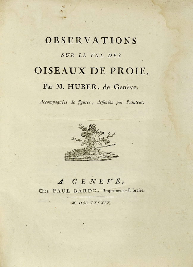 Huber Jean, Observations sur le vol des oiseaux de proie. A Geneve: chez Paul Barde, 1784.