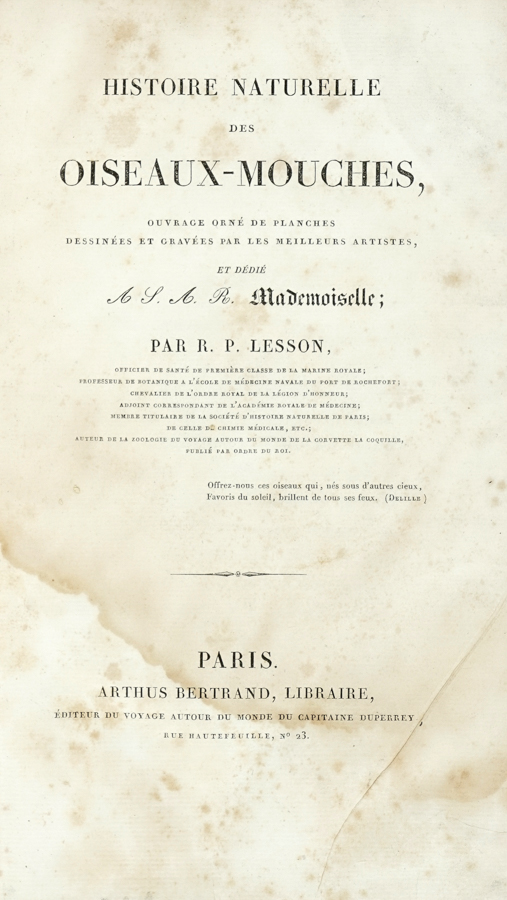 Lesson René Primevère, Histoire naturelle des oiseaux-mouches, ouvrage orne de planches dessinees et gravees par le meilleurs artistes... Paris: Arthus Bertrand, s.d. [i.e. 1829-1830].