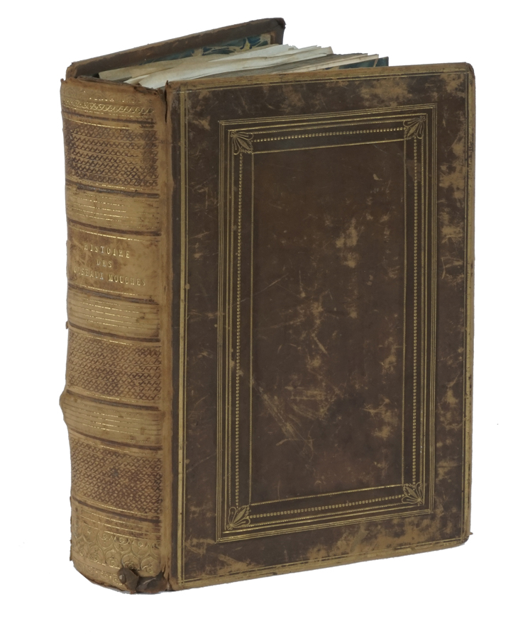 Lesson René Primevère, Histoire naturelle des oiseaux-mouches, ouvrage orne de planches dessinees et gravees par le meilleurs artistes... Paris: Arthus Bertrand, s.d. [i.e. 1829-1830]. In-8° grande (mm 225x135). Pagine [6], X-XLVI, 2 bianche, 223, 1 bianca con 86 tavole a colori e piena pagina numerate 1-48, 48 bis, 49-85. Copia gorata. Legatura coeva in piena pelle con cornici concentriche impresse in oro ai dorsi e titolo dorato al dorso. Tagli e sguardie in carta marmorizzata. Segni d'uso a piatti, dorso e cerniere, staccato parzialmente il piatto posteriore. (1)Prima edizione di questa bella monografia sui colibrì, profusamente illustrata. L'autore, inizialmente medico di marina, compì il giro del mondo sulla corvetta Coquille tra il 1822 e il 1825: al ritorno pubblicò numerosi volumi di ornitologia e zoologia in generale, specializzandosi sui colibrì e gli uccelli del paradiso. Nissen IVB 547; Anker 291; Ronsil, p. 290.