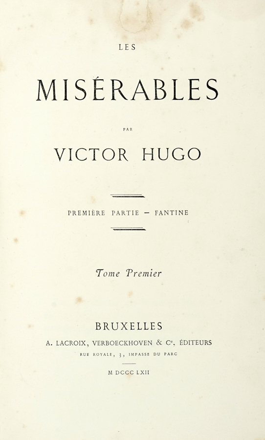 Hugo Victor, Les Misérables [...]. Tome Premier (-Dixième). Bruxelles: A. Lacroix, Verboeckhoven & C.e, 1862.
