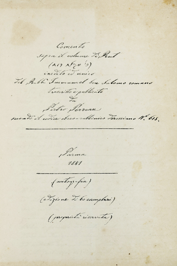 Immanuel Romano Immanuel Romano, Commento sopra il volume di Rut […] inedito e unico [...] trascritto e pubblicato da Pietro Perreau secondo il codice ebreo-rabbinico... Parma: s.e., 1881.