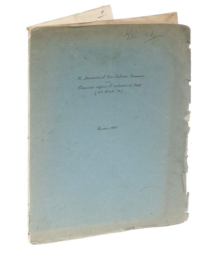 Immanuel Romano Immanuel Romano, Commento sopra il volume di Rut […] inedito e unico [...] trascritto e pubblicato da Pietro Perreau secondo il codice ebreo-rabbinico... Parma: s.e., 1881. In-4° (mm 300x210). Pagine [2], 44. Minimi segni di usura. Legatura in carta con titoli manoscritti al dorso; strappi marginali ai piatti e mancanze al dorso. (1)