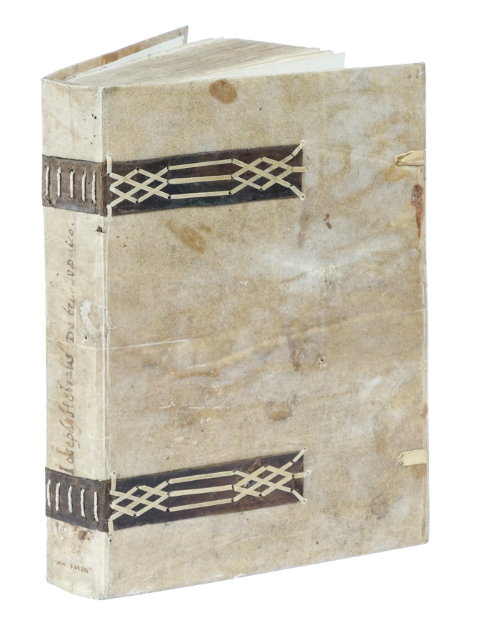 Iosephus Flavius, De antiquitate Judaica. De bello Judaico. (Al colophon:) Verona: Petrus Maufer, de Maliferis, for Innocens Ziletus, 25 December 1480. In-folio (mm 300x206). Carte [214]. Segnatura: [π2], a10, b8, c6, d–k8, kk8, l–x8, y6, A–C8, D6. Testo in carattere romano su 35-36 linee. Presente la rara carta bianca che segue la dedica (carte π2). Copia non rubricata. Gore marginali ad alcuni fascicoli, qualche forellino di tarlo che non coinvolge l'inciso e lievi fioriture sparse, altrimenti buona copia marginosa. Legatura successiva in piena pergamena, con cinghie in cuoio in stile archivistico e lacerti di legacci in pergamena. Titoli manoscritti al dorso e sguardie rinnovate. Macchie ai piatti. Timbro abraso alla prima carta di dedica ed ex-libris al contropiatto anteriore. (1)Bellissima copia di questa quarta edizione, la prima stampata in Italia, dell'opera di Iosephus Flavius; si tratta, inoltre, dell'unica edizione stampata da Pierre Maufer, nativo di Rouen Maliferis, durante il suo soggiorno veronese. Il testo è dedicato dallo studioso veronese Ludovico Cendrata (allievo di Guarino Veronese), ad Antonio Donato, patrizio e ambasciatore veneziano, che nel 1480 fu governatore di Verona. Goff J484; BMC VII 951; IGI 5388.