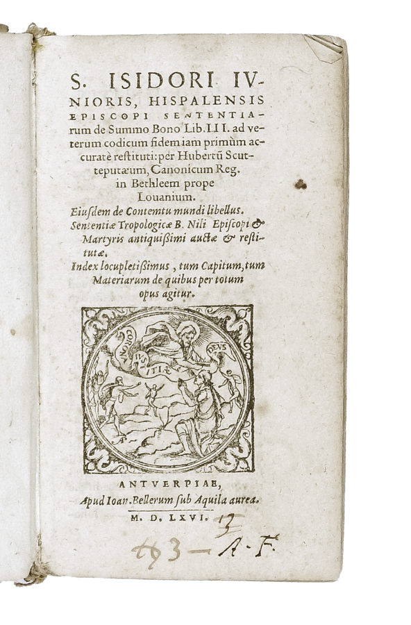 Isidorus Hispalensis (santo), Sententiarum de Summo Bono Lib. 3. Antverpiae: apud Ioan. Bellerum sub Aquila aurea, 1566.
