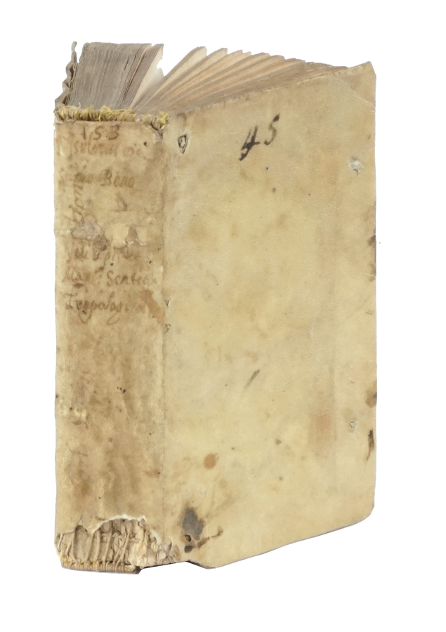 Isidorus Hispalensis (santo), Sententiarum de Summo Bono Lib. 3. Antverpiae: apud Ioan. Bellerum sub Aquila aurea, 1566. In-12° (mm 126x72). Carte [12], 189, [15]. Marca tipografica al frontespizio, capilettera in legno nel testo. Carte lievemente brunite con fioriture sparse. Fascicoli allentati. Lieve gora d'acqua al margine superiore degli ultimi fascicoli. Legatura in piena pergamena molle con titoli manoscritti al dorso. Mancanze alla cuffia inferiore, macchie ai piatti. Postilla di mano antica al frontespizio e al piatto anteriore. (1)Edizione successiva di quest'opera religiosa dell'Arcivescovo di Siviglia. Non in Adams.