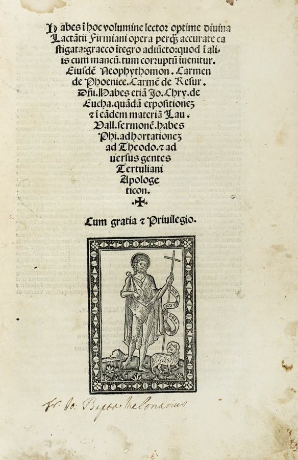 Lactantius Lucius Caecilius Firmianus, Opera perquam accurate castigata... (Al colophon:) Impressum Venetiis: arte et impensis Ioannis Tacuini, 152 [i.e. 1502] die iii e nono Ianuarii.